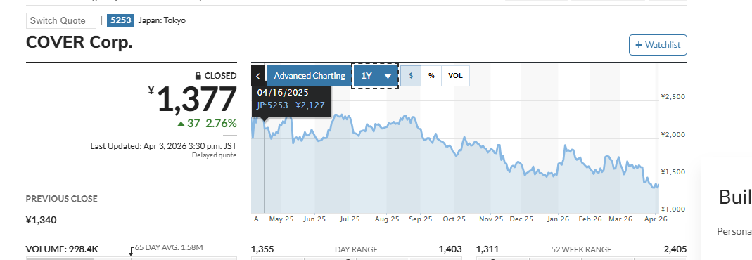 >>110799392>The last time their stock price was over 2k JPY was on April 15th, 2025.>On April 16, 2025 The market opened with a immediate 10% drop.what the fuck happened on that day where cover never recovered since?