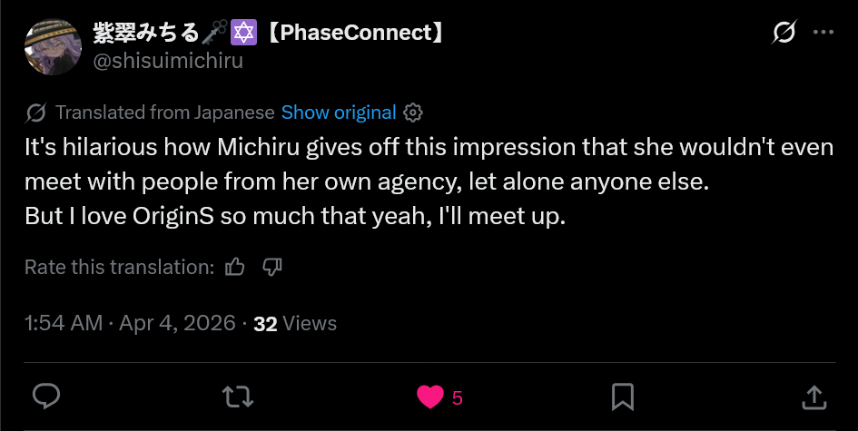 >>110800045They really seem like the only gen that are all actual IRL friends that constantly take trips to see each other. It really is amazing and I wish more chuuba gens were like that.