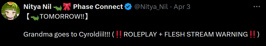 ▼ Phase Connect LinksOfficial Website: https://phase-connect.comOfficial Schedule: https://schedule.phase-connect.comOfficial Twitter: https://x.com/PhaseConnect | https://x.com/PhaseConnectJPOfficial Character References: https://rentry.org/pcgreferencesOfficial Twitch Archive Channels: https://rentry.org/pcgtwitcharchiveUnofficial Phase Connect Archives: https://rentry.org/pcgunofficialarchive––––––––––––––––––––––––––––––––––◆【Lia】https://x.com/rinkouashelia | https://youtube.com/RinkouAshelia | https://twitch.tv/asheliarinkou◆【Utatane Nasa】転寝ナサ (JP) https://x.com/UtataneNasa | https://youtube.com/UtataneNasa | https://twitch.tv/utatanenasa◆【Hakushika Iori】白鹿いおり (JP + EN) https://x.com/hakushikaiori | https://youtube.com/HakushikaIori | https://twitch.tv/iorihakushika◆【Fujikura Uruka】https://x.com/fujikurauruka | https://youtube.com/FujikuraUruka | https://twitch.tv/fujikurauruka◆【Shisui Michiru】紫翠みちる (JP) https://x.com/shisuimichiru | https://youtube.com/ShisuiMichiru | https://twitch.tv/michiru_shisui◆【Tenma Maemi】https://x.com/tenmamaemi | https://youtube.com/TenmaMaemi | https://twitch.tv/tenma◆【Pipkin Pippa】https://x.com/pipkinpippa | https://youtube.com/PipkinPippa | https://twitch.tv/pippa––––––––––––––––––––––––––––––––––◆【Kaneko Lumi】https://x.com/kaneko_lumi | https://youtube.com/KanekoLumi | https://twitch.tv/kanekolumi◆【Fuura Yuri】[Terminated] https://x.com/AmarisYuri | Archive: https://youtube.com/@TheNationalFuuraYuriArchive◆【Dizzy Dokuro】https://x.com/dizzydokuro | https://youtube.com/@dizzydokuro | https://twitch.tv/dizzydokuro◆【Jelly Hoshiumi】https://x.com/jellyhoshiumi | https://youtube.com/@jellyhoshiumi | https://twitch.tv/jellyhoshiumi◆【Ember Amane】https://x.com/emberamane | https://youtube.com/@EmberAmane | https://twitch.tv/emberamane◆【Clio Aite】https://x.com/ClioAite | https://youtube.com/@ClioAite | https://twitch.tv/clioaite◆【MariMari_en】https://x.com/MARIMARI_EN | https://youtube.com/@MARIMARI_EN | https://twitch.tv/marimari_en◆【Eepy Sleepy】https://x.com/EepySleepyCh | https://youtube.com/@EepySleepyCh | https://twitch.tv/EepySleepy––––––––––––––––––––––––––––––––––◆【Remilia Nephys】https://x.com/Remilia_Nephys | https://youtube.com/RemiliaNephys | https://twitch.tv/remilianephys◆【Chisaka Airi】https://x.com/ChisakaAiri | https://youtube.com/ChisakaAiri | https://twitch.tv/chisakaairi◆【Amanogawa Shiina】https://x.com/AmanogawaShiina | https://youtube.com/AmanogawaShiina | https://twitch.tv/amanogawashiina◆【Himemiya Rie】https://x.com/HimemiyaRie | https://youtube.com/HimemiyaRie | https://twitch.tv/himemiyarie◆【Erina Makina】https://x.com/ErinaMakina | https://youtube.com/ErinaMakina | https://twitch.tv/erinamakina◆【Komachi Panko】https://x.com/komachipanko | https://youtube.com/KomachiPanko | https://twitch.tv/komachipanko––––––––––––––––––––––––––––––––––◆【Runie Ruse】https://x.com/RunieRuse | https://youtube.com/@RunieRuse | https://twitch.tv/RunieRuse◆【Eimi Isami】https://x.com/eimiisami | https://youtube.com/@eimiisami | https://twitch.tv/eimiisami◆【Muu Muyu】https://x.com/Muu_Muyu | https://youtube.com/@MuuMuyu | https://twitch.tv/MuuMuyu◆【Hikanari Hina】https://x.com/HikanariHina | https://youtube.com/@HikanariHina | https://twitch.tv/HikanariHina◆【Saya Sairroxs】[Phase Citizen] https://x.com/sayasairroxs | https://youtube.com/@sayasairroxs | https://twitch.tv/sayasairroxs––––––––––––––––––––––––––––––––––◆【Kannagi Loki】巫ロキ (JP) https://x.com/kannagiloki | https://youtube.com/@kannagiloki◆【Kokoromo Memory】[Phase Citizen] https://x.com/kokoromomemory | https://youtube.com/@kokoromomemory_ | https://twitch.tv/kokoromomemory◆【Gram Pico】倉夢ぴこ (JP) https://x.com/grampico_ | https://youtube.com/@grampico | https://twitch.tv/grampico◆【Ayase Yuu】絢世ユウ (JP) https://x.com/ayaseyuuu | https://youtube.com/@ayaseyuu | https://twitch.tv/ayaseyuu_◆【Kaminari Clara】[Graduated] https://x.com/kaminariclara_ | https://youtube.com/@kaminariclara | https://twitch.tv/kaminariclara––––––––––––––––––––––––––––––––––◆【Malice Evermore】https://x.com/MaliceEvermore | https://youtube.com/@maliceevermore | https://twitch.tv/maliceevermore◆【Nitya Nil】https://x.com/Nitya_Nil | https://youtube.com/@Nitya_Nil | https://twitch.tv/nitya_nil◆【Wilhelmina Frost】https://x.com/wilhelminafr0st | https://youtube.com/@wilhelminafrost | https://twitch.tv/wilhelminafrost◆【Bibi Biscuit】https://x.com/BibiBiscuitCh | https://youtube.com/@bibibiscuitch | https://twitch.tv/bibibiscuitch◆【Anya Nyabyss】https://x.com/AnyaNyabyss | https://youtube.com/@AnyaNyabyss | https://twitch.tv/anyanyabyss◆【Sinon Sinfonia】https://x.com/SinonSinfonia | https://youtube.com/@SinonSinfonia | https://twitch.tv/sinonsinfoniaPrevious Thread: >>110799824
