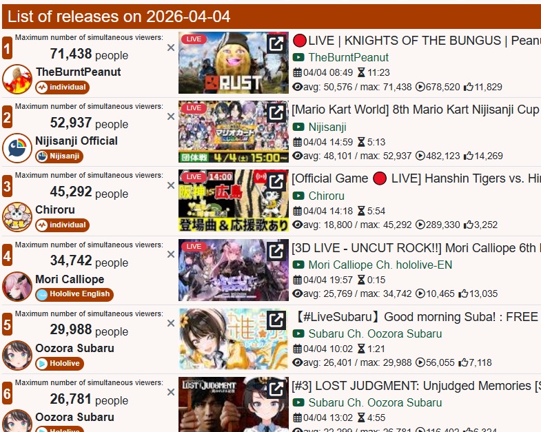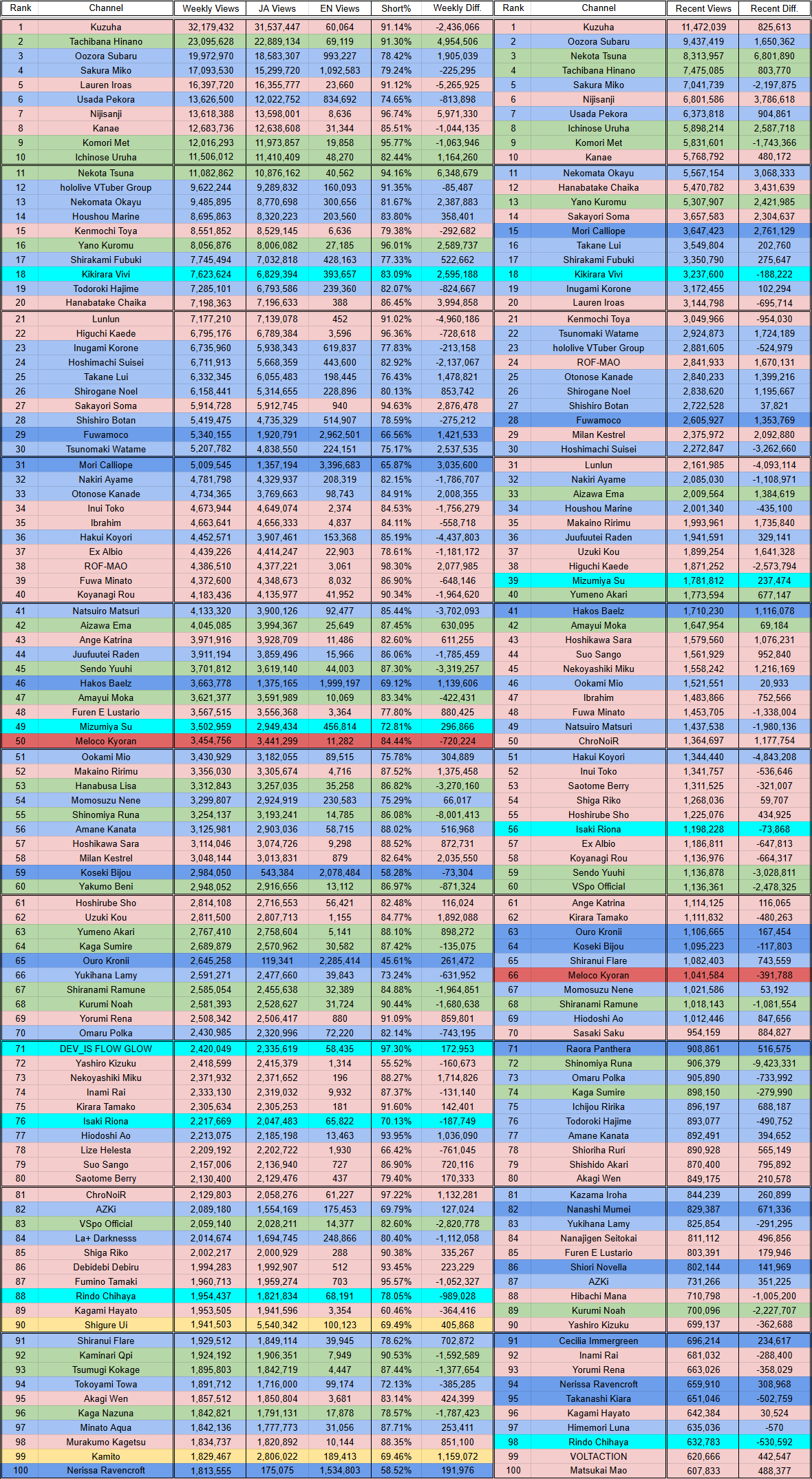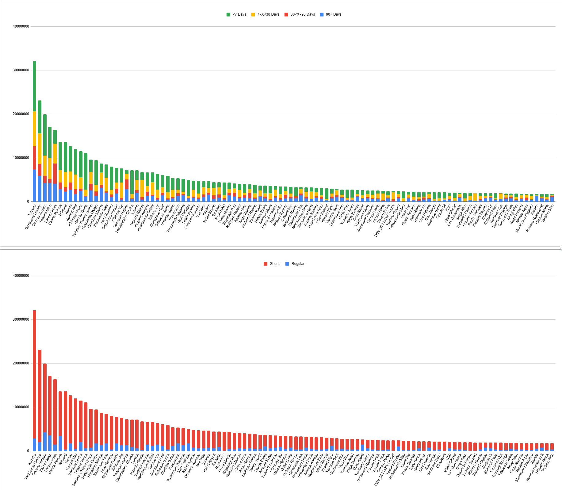 More clip numbers.(HL, NJ, VS)Split is 250.5M(+4.5M), 255.3M(+5.7M), 109.2M(-19.4M)Recent is 103.9M(+1.5M), 99.7M(+13.3M), 46.0M(-17.1M)JA Split is 199.4M(-100k), 251.9M(+6.8M), 107.6M(-18.6M)EN Split is 36.4M(+4.6M), 1.9M(+150k), 690k(-370k)Regular Split is 58.1M(+1.1M), 37.1M(-1.3M), 7.4M(-6.4M)Shorts Split is 192.3M(+3.3M), 218.2M(+7.0M), 101.8M(-13.0M)