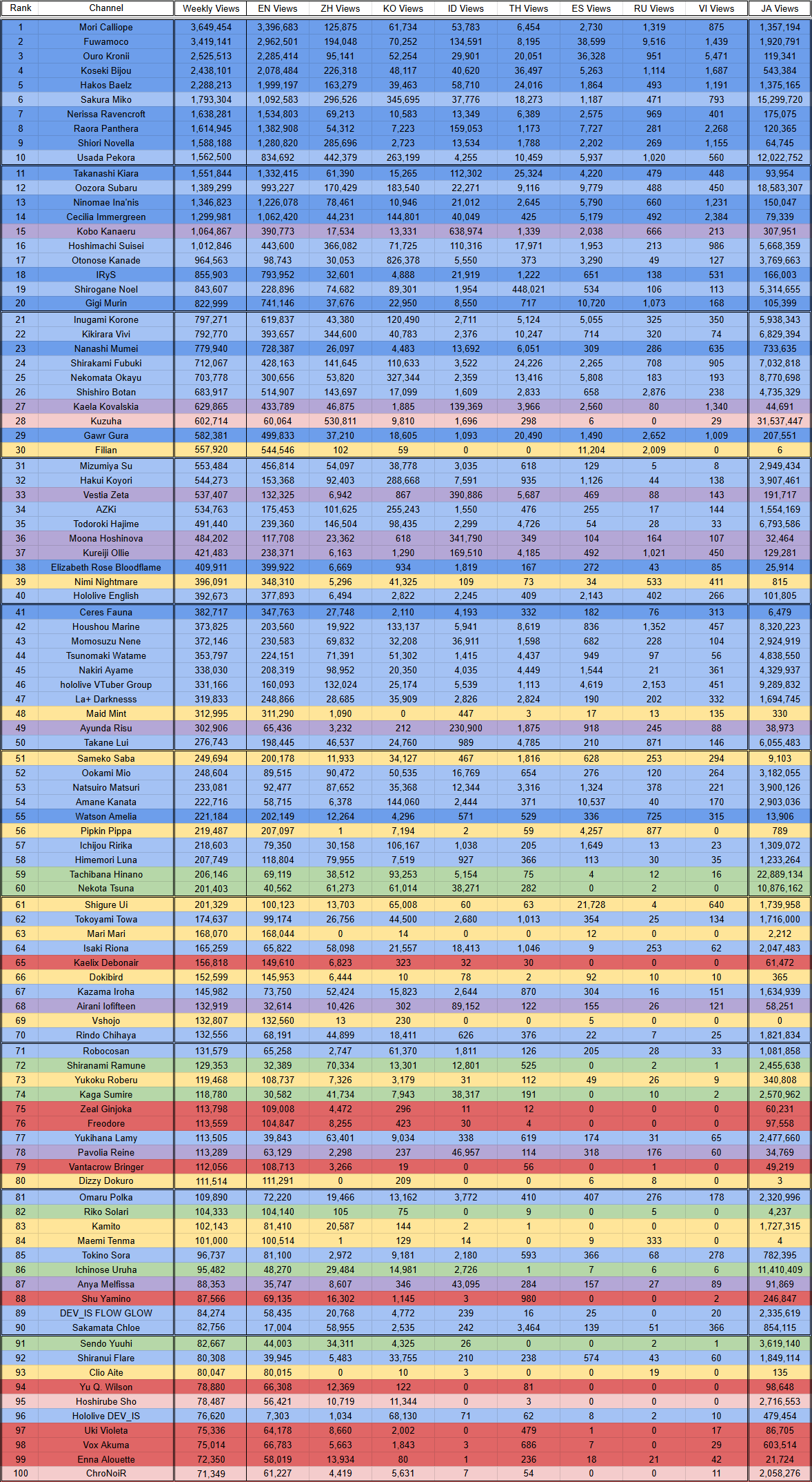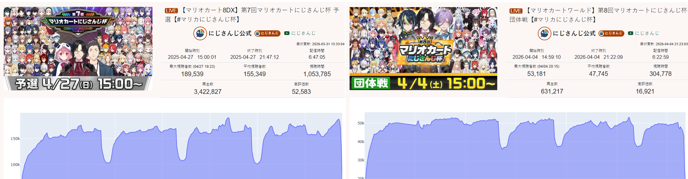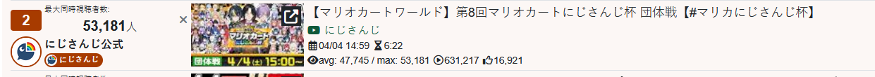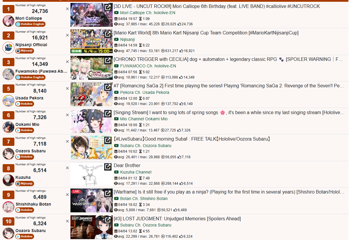 More clip numbers.(HL, NJ, VS)Split is 250.5M(+4.5M), 255.3M(+5.7M), 109.2M(-19.4M)Recent is 103.9M(+1.5M), 99.7M(+13.3M), 46.0M(-17.1M)JA Split is 199.4M(-100k), 251.9M(+6.8M), 107.6M(-18.6M)EN Split is 36.4M(+4.6M), 1.9M(+150k), 690k(-370k)Regular Split is 58.1M(+1.1M), 37.1M(-1.3M), 7.4M(-6.4M)Shorts Split is 192.3M(+3.3M), 218.2M(+7.0M), 101.8M(-13.0M)
