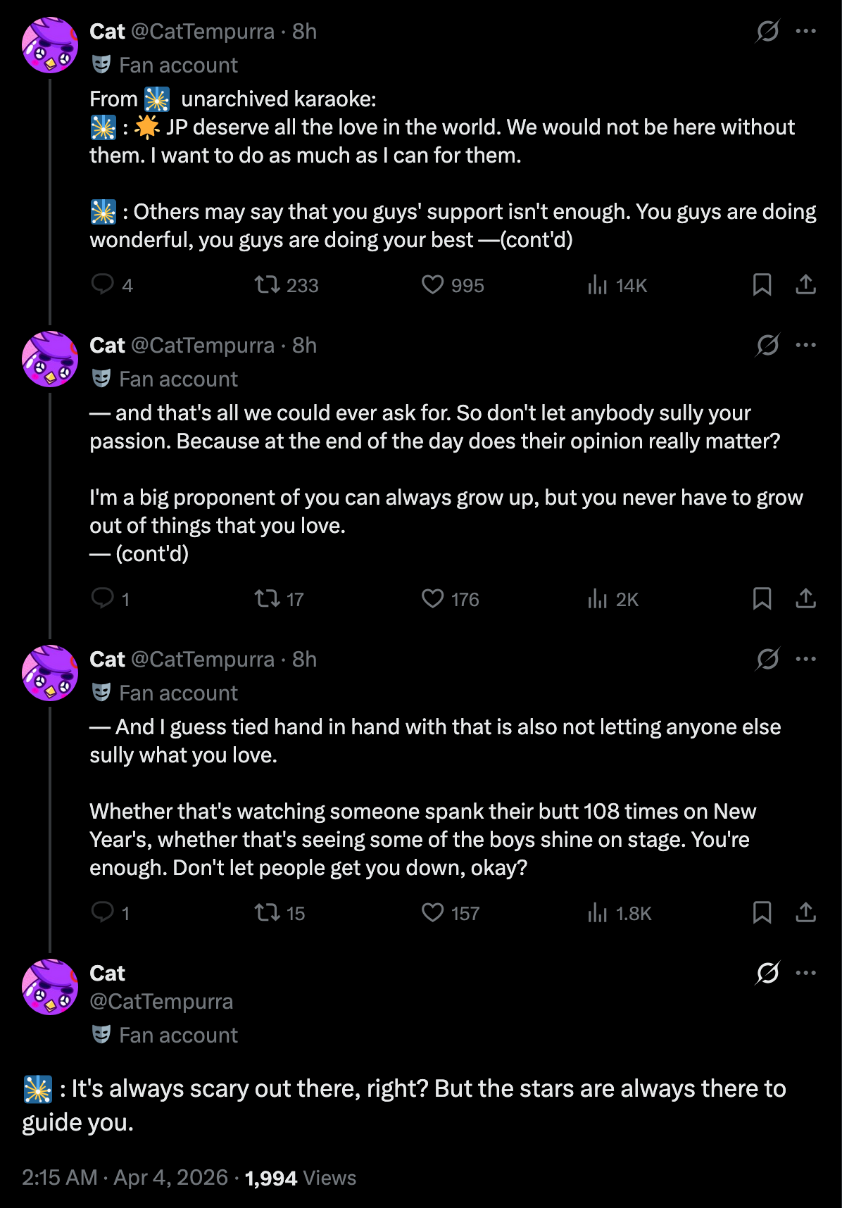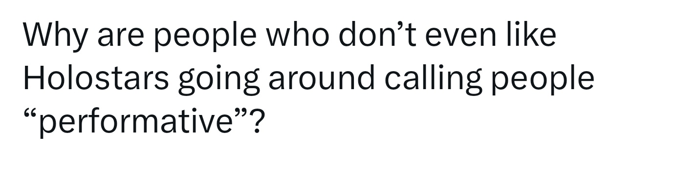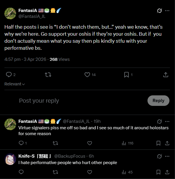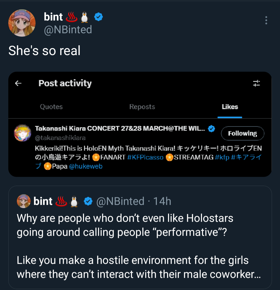 >>110809354No, again retard, that is about the fake "fans" of the homos in the responses to her post that self admittedly don't even watch streams but have the nerve to call Kiara performative