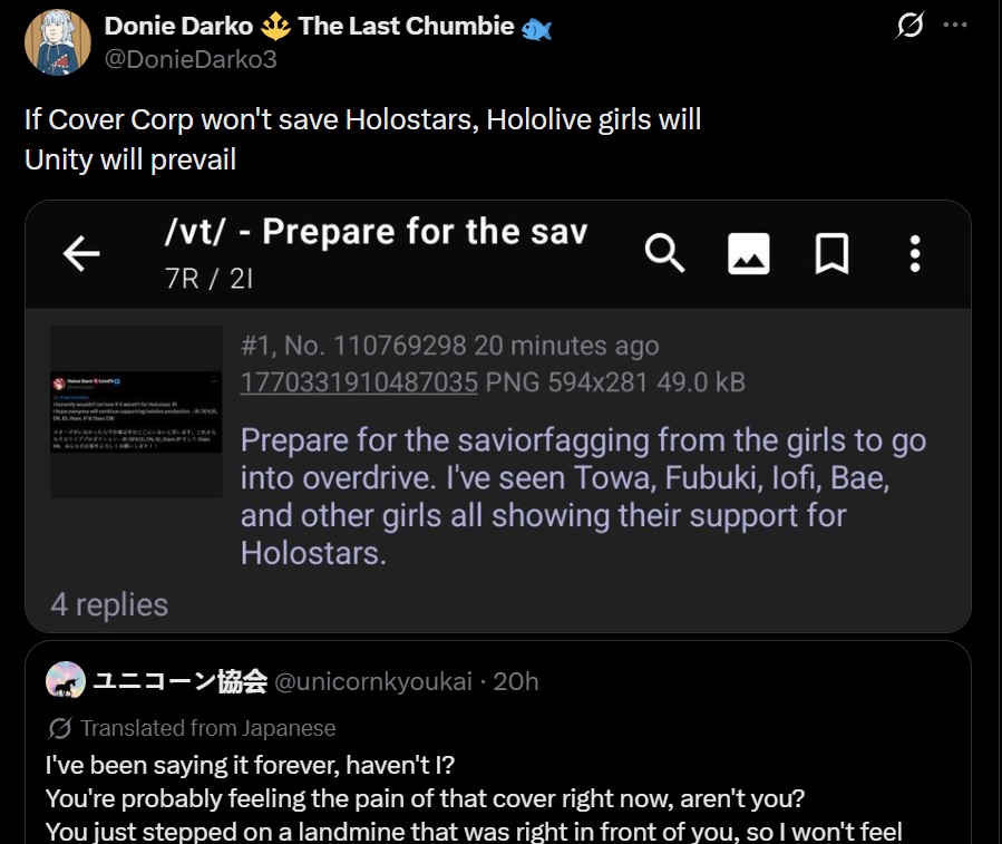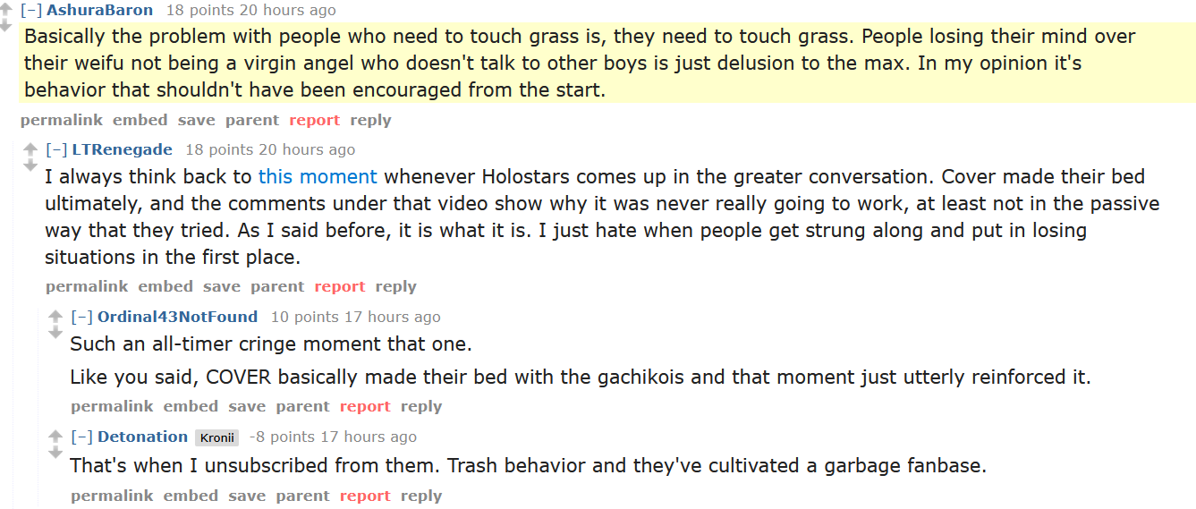Again, the funniest part is that even their MINECRAFT SERVER got shut down.The company went SCORCHED EARTH on anything homo related and, here is the amusing part>that was the COMPROMISE SOLUTION, the merciful oneThe company preferred solution was clearly to HoloCN the branch but ended up leaving them with their channels and models in a sort of “indie arrangement” except they need permission to do ANYTHING using said channel and model>merch? Can commission out of their pockets if granted permission>illusts? Can commission out of their pockets if granted permission>new outfits: I don’t think they can even ask permission>3D: can’t use Cover studio, can procure an external one if granted permission>merch: I’m not sure they can even ask for permission, I think it’s NGAll in all they’re frozen out of anything new except streaming in the channels they have now with the models they have now.In Brazil they call this “bolinha de ouro”: when playing tag sometimes kids too small to be competitive are allowed to play but they can’t be tagged, they’re running around with the big boys but they’re not really playing the game.That’s the role for the homos now, they’re “bolinha de ouro”(In your countries there is a similar expression?)Anon mentioned giving a disconnected controller to your young brother, that’s appropriate too.