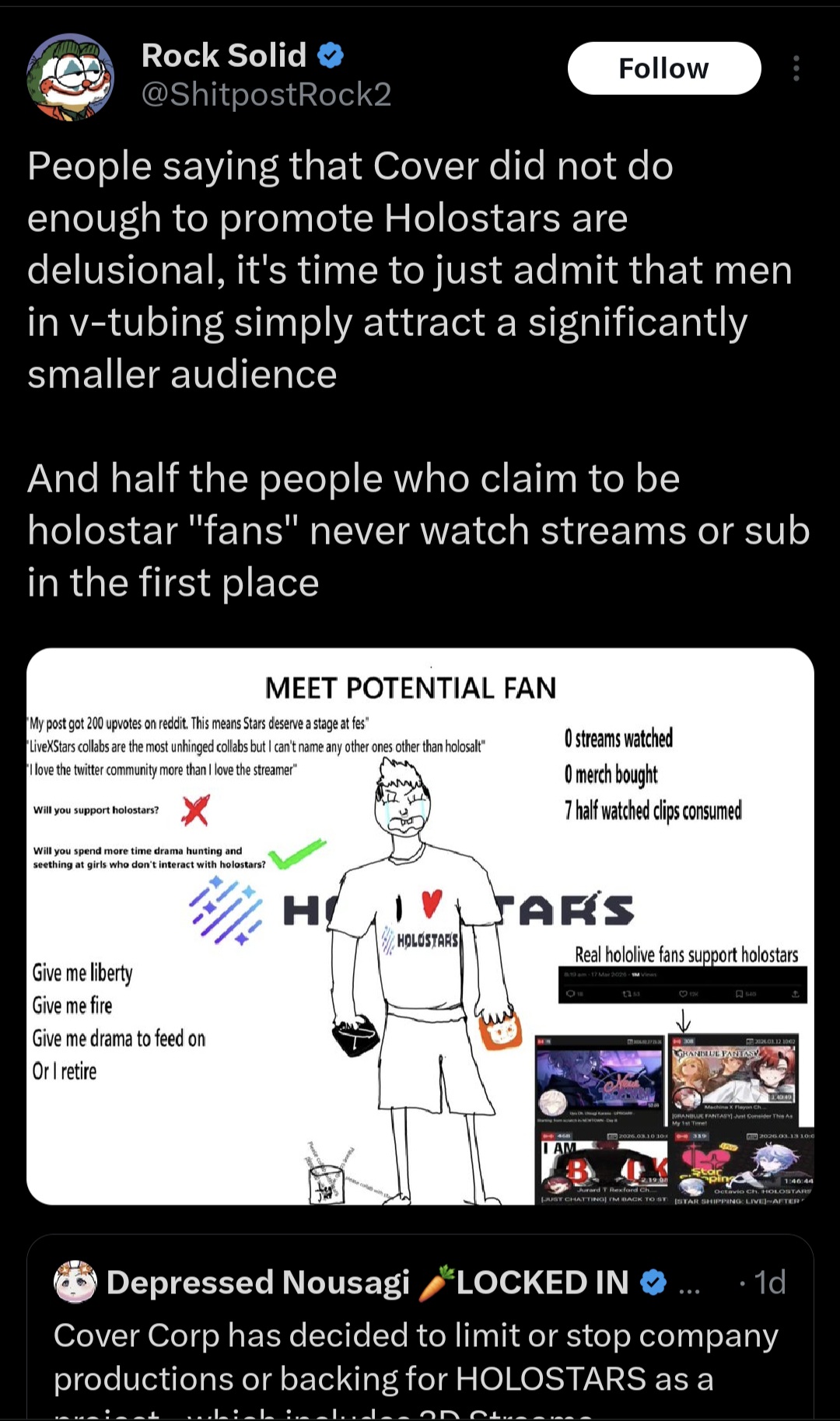 >>110809293I'm not sure that rock solid guy even watches vtubers lmao he only ever tweets about video games and copies memes