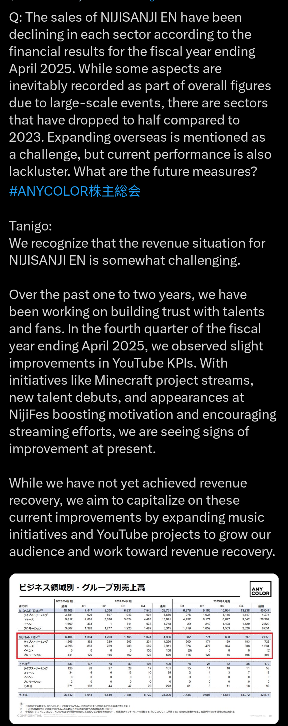 She saw what just happened to Holostars, knows that she and the rest of Niji EN are about to get it much, MUCH worse, and has to continue pretending that she doesn't see the writing on the wall. Cover sending Holostars to the Banishment Room gives Anycolor cover to nuke Niji EN without losing (as much) face with the investors.And as an added "bonus," Stars' fate was published after market close on the first Friday of Cover's fiscal year. The first Friday of Anycolor's fiscal year (May 1) also happens to be the last business day before Golden Week - a very long weekend. Long enough that the investors' anger at Anycolor ending its overseas expansion might cool off before the markets reopen the following Thursday.>>110812415She has a PL Throne. Even ignoring the part where she get to keep less than 35% of her superchat money, she's still making more money on Throne than on YT.