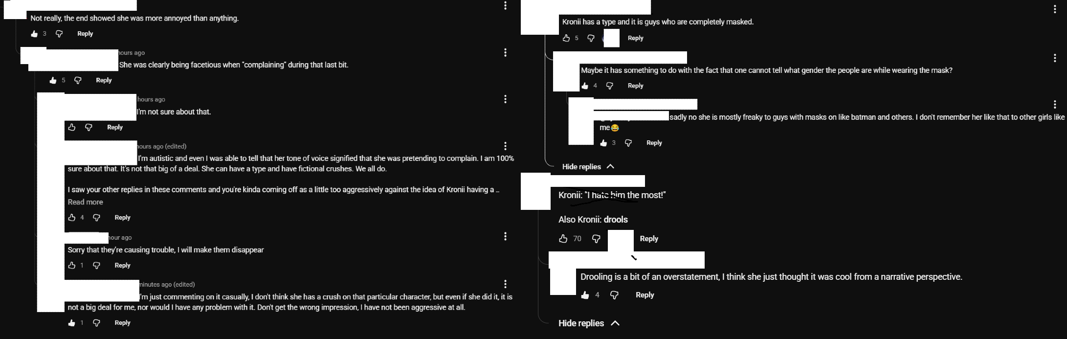 So yeah, what happened is that I commented in a respectful and casual manner in a clipper channel. And my comments were deleted even though I didn't say anything inappropriate.If anything some of the comments I saw were way more risqué. Things like "The mask stays on", which implies that the commenter is imagining Kronii having sex.What the hell? It looks like some Kronies are intolerant of different opinions. And also, what is going on with this person with autism. He is aware that he has autism, and yet he is confident about his assessment of intonation, even though he obviously shouldn't be due to his condition.