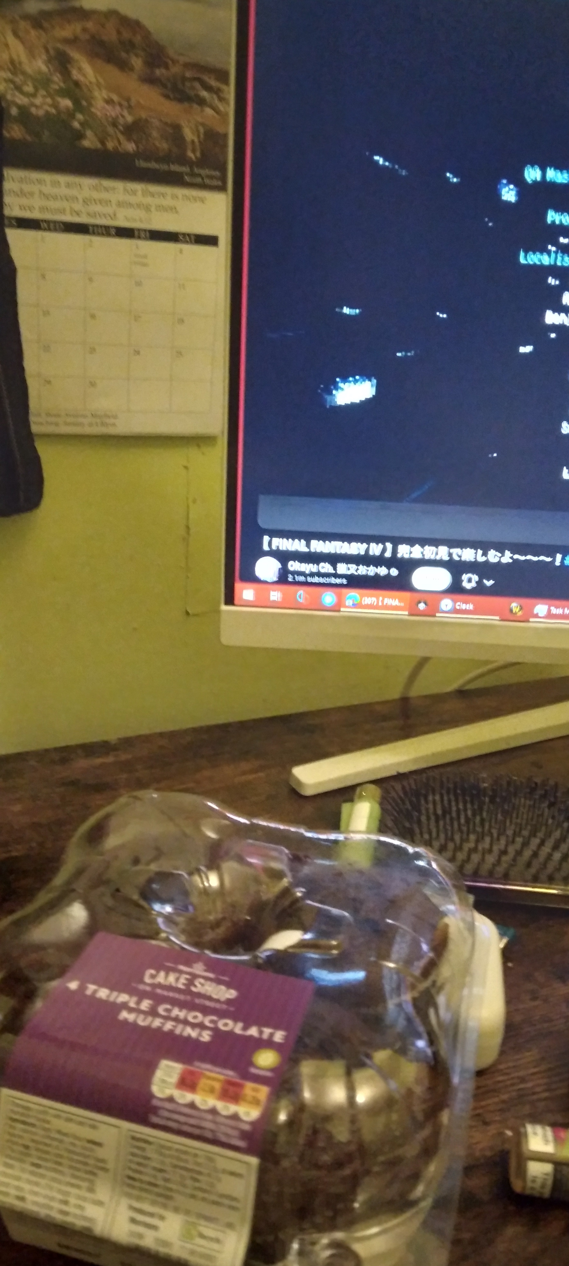 Back from work. I caught the FFIV ending of Okayu's stream on the journey home.Also, I got muffins.