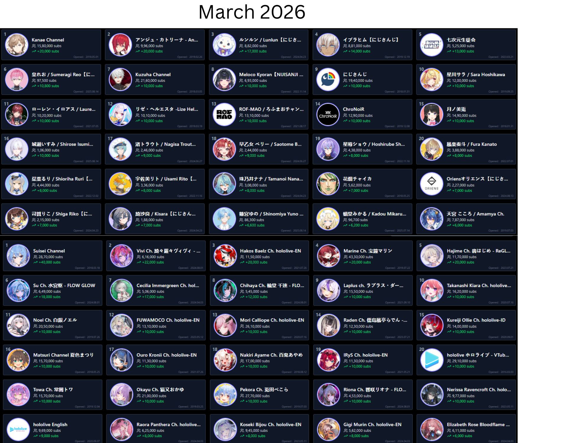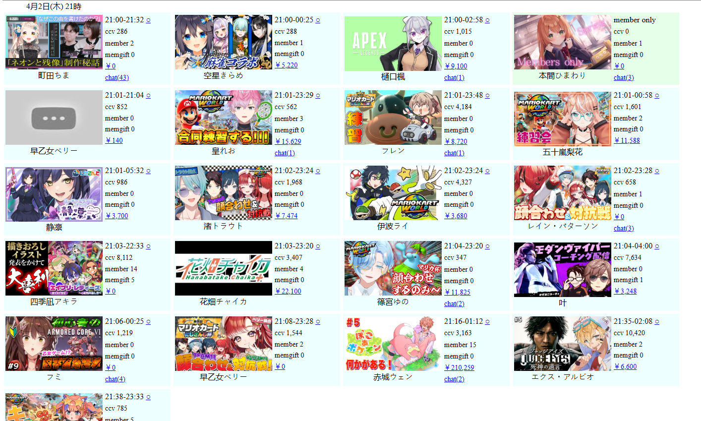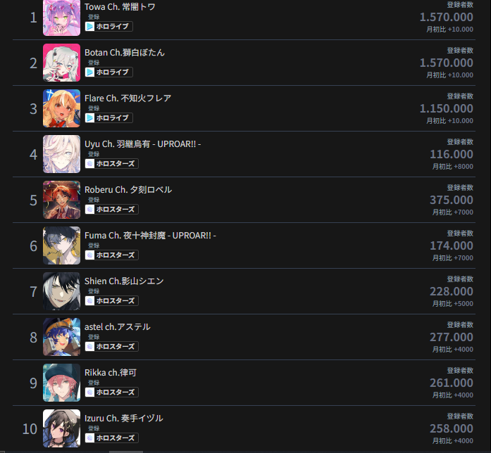 *GENERAL NUMBERFAG SITES*>https://playboard.co/en/>http://ikioi-ranking.com/>https://vrabi.net/>https://vtubertracker.info/en>https://live-ranking.userlocal.jp/vtuber-ranking>https://vstats.jp/Hololive sites>https://www.hololyzer.net/youtube/index.html>https://trackholo.live/en/>https://holo-spotify-stats.jirikunes.eu/>https://holo-tracker.vercel.app/>https://www.holostats.com/Twitch>https://sullygnome.com/>https://twitchtracker.com/>https://stats.roki.sh/>https://streamscharts.com/