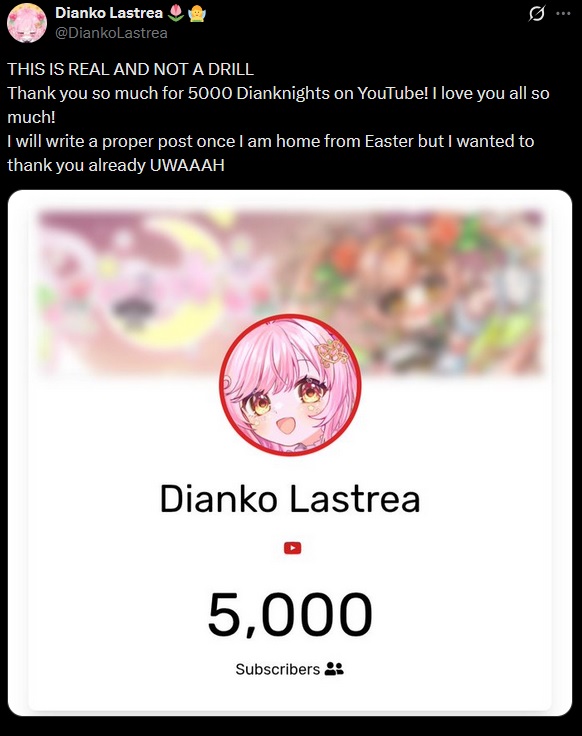 Speaking of birthdays, Dianko's is next saturday and she got her wish of getting to 5k before then x.com/DiankoLastrea/status/2040806077361500658