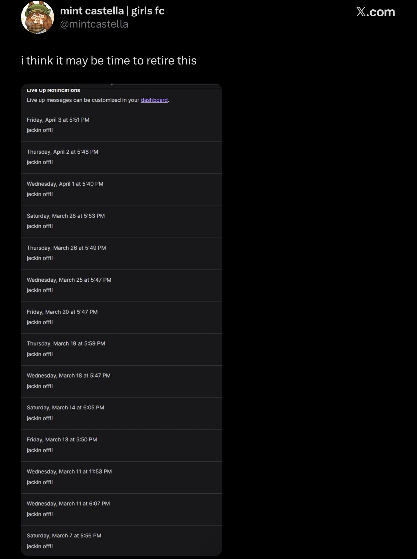 https://x.com/Girl_Dm_/status/2040913238305734755Yeah, this isn't a woman who gets laid.