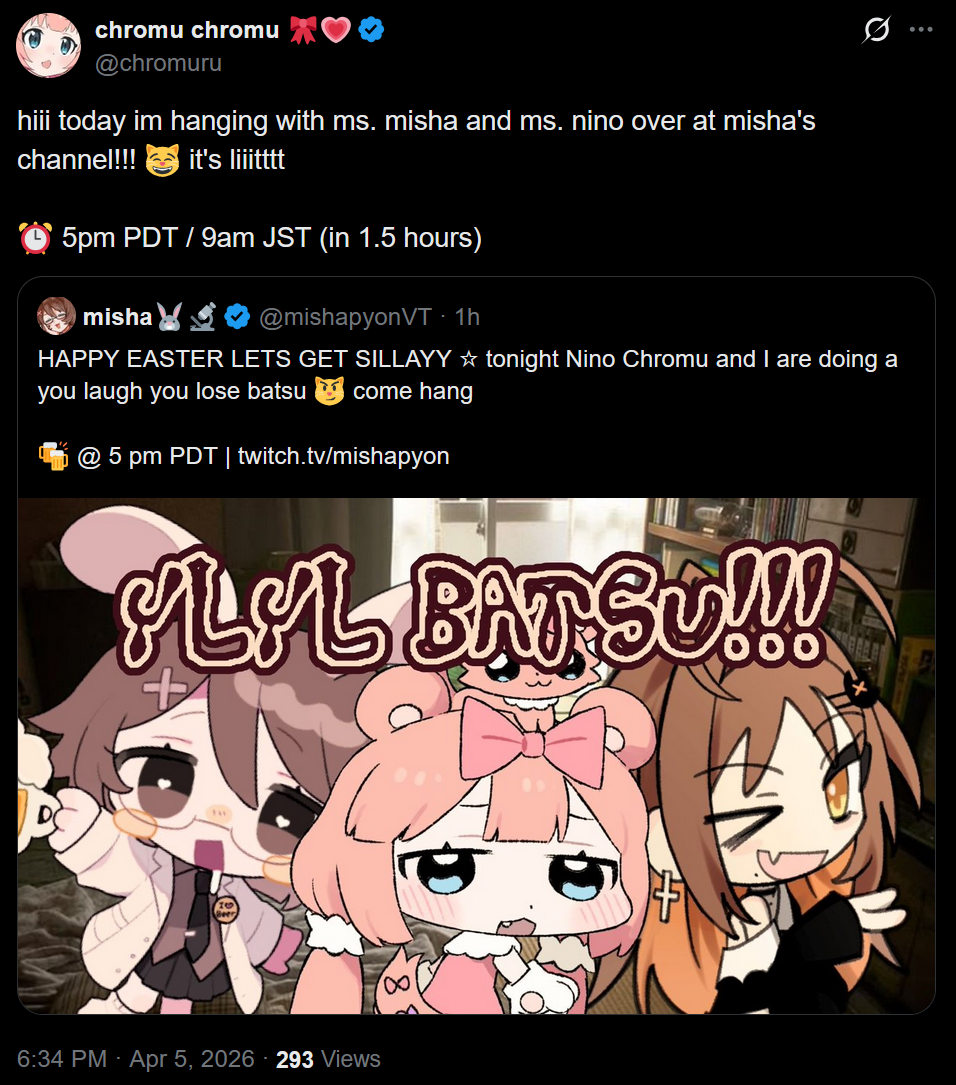 Feral Edition>What is /lig/?/lig/ is a thread for viewers to find, share, and discuss indie vtubers who have on average 500 viewers or more.>Why /lig/?Large indie vtubers have more net fans, but they are outnumbered by 2views by the thousands. This is a thread for the VIP, regardless of what language they stream on.>Can I shill my 499view oshi here?Considering averages fluctuate widely, all the way down to 100 is reasonable. The minimal requirement however is being Twitch partner or the YouTube equivalent in numbers.>Wait isn't that one a corpo?/lig/ is a thread for chuubas of a decent size who aren't defined by their corporate branding, either due to the small size of the corporation or the independence and lack of oversight granted to the talents>/lig/ Numbershttps://lignumbers.neocities.org/>Twitch Clips Guidehttps://pastelink.net/34vd5>VOD Archival Guidehttps://rentry.org/Vod_Archival_Guide>/lig/ VOD Archivehttps://rentry.org/Indie_Vod_Archives_lig_>Koikatsu cardshttps://mega.nz/folder/JYtkXJwL#07gAQCQqI_9FsmX9oQJKSA>/lig/ Wheel of Nameshttps://wheelofnames.com/5jh-93j>Tiermakerhttps://tiermaker.com/create/-lig--16586688-3>/lig/ Chuuba Birthday Calendar (WIP)https://www.canva.com/design/DAE-XgWodVg/ofLz4QC1yPPQ4T6TTAE0fw/edit?utm_content=DAE-XgWodVg>Upcoming BirthdaysApril 11th - Ume AinoApril 18th - SarueiApril 19th - Yoclesh & ZumaApril 23rd - Coqui & Limealicious & MomotexxApril 24th - Sugi AokiApril 27th - Peach MilkyMay 3rd - CharlottexBearMay 4th - Dya Rikku & ImakuniMay 6th - Nino EgynMay 14th - Peo YukinoshitaMay 17th - Grimmi>OC material for the OPhttps://mega.nz/folder/IIVD1IaJ#cfsRhWdJvzneIoG8HZUPuw>/lig/booruhttps://ligbooru.moe/>Duckshttps://www.twitch.tv/dashducks (embed) (embed) (embed) (embed) (embed) (embed) (embed) (embed)Other useful threads:>>>/vt//big/>>>/vt//corpo/>>>/vt//choc/>>>/vt//flip/>>>/vt//haha/>>>/vt//indie/>>>/vt//mint/>>>/vt//swarm/>>>/vt//vrt/>>>/vt//xvsj+/Previous Thread: >>110845180