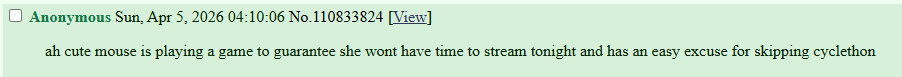 >>110858945>Mouse mentioned yesterday that she had to leave early for recordings so it would be a short streamWatch streams and shut the fuck up
