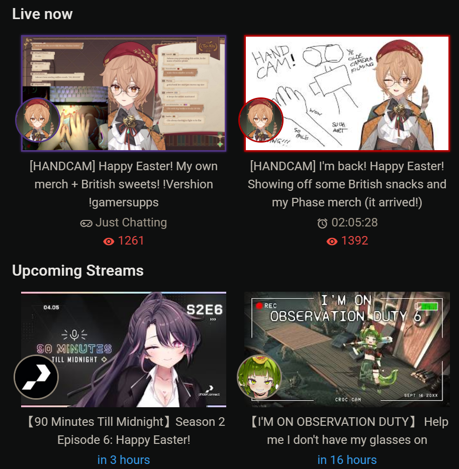 ▼ Phase Connect LinksOfficial Website: https://phase-connect.comOfficial Schedule: https://schedule.phase-connect.comOfficial Twitter: https://x.com/PhaseConnect | https://x.com/PhaseConnectJPOfficial Character References: https://rentry.org/pcgreferencesOfficial Twitch Archive Channels: https://rentry.org/pcgtwitcharchiveUnofficial Phase Connect Archives: https://rentry.org/pcgunofficialarchive––––––––––––––––––––––––––––––––––◆【Lia】https://x.com/rinkouashelia | https://youtube.com/RinkouAshelia | https://twitch.tv/asheliarinkou◆【Utatane Nasa】転寝ナサ (JP) https://x.com/UtataneNasa | https://youtube.com/UtataneNasa | https://twitch.tv/utatanenasa◆【Hakushika Iori】白鹿いおり (JP + EN) https://x.com/hakushikaiori | https://youtube.com/HakushikaIori | https://twitch.tv/iorihakushika◆【Fujikura Uruka】https://x.com/fujikurauruka | https://youtube.com/FujikuraUruka | https://twitch.tv/fujikurauruka◆【Shisui Michiru】紫翠みちる (JP) https://x.com/shisuimichiru | https://youtube.com/ShisuiMichiru | https://twitch.tv/michiru_shisui◆【Tenma Maemi】https://x.com/tenmamaemi | https://youtube.com/TenmaMaemi | https://twitch.tv/tenma◆【Pipkin Pippa】https://x.com/pipkinpippa | https://youtube.com/PipkinPippa | https://twitch.tv/pippa––––––––––––––––––––––––––––––––––◆【Kaneko Lumi】https://x.com/kaneko_lumi | https://youtube.com/KanekoLumi | https://twitch.tv/kanekolumi◆【Fuura Yuri】[Terminated] https://x.com/AmarisYuri | Archive: https://youtube.com/@TheNationalFuuraYuriArchive◆【Dizzy Dokuro】https://x.com/dizzydokuro | https://youtube.com/@dizzydokuro | https://twitch.tv/dizzydokuro◆【Jelly Hoshiumi】https://x.com/jellyhoshiumi | https://youtube.com/@jellyhoshiumi | https://twitch.tv/jellyhoshiumi◆【Ember Amane】https://x.com/emberamane | https://youtube.com/@EmberAmane | https://twitch.tv/emberamane◆【Clio Aite】https://x.com/ClioAite | https://youtube.com/@ClioAite | https://twitch.tv/clioaite◆【MariMari_en】https://x.com/MARIMARI_EN | https://youtube.com/@MARIMARI_EN | https://twitch.tv/marimari_en◆【Eepy Sleepy】https://x.com/EepySleepyCh | https://youtube.com/@EepySleepyCh | https://twitch.tv/EepySleepy––––––––––––––––––––––––––––––––––◆【Remilia Nephys】https://x.com/Remilia_Nephys | https://youtube.com/RemiliaNephys | https://twitch.tv/remilianephys◆【Chisaka Airi】https://x.com/ChisakaAiri | https://youtube.com/ChisakaAiri | https://twitch.tv/chisakaairi◆【Amanogawa Shiina】https://x.com/AmanogawaShiina | https://youtube.com/AmanogawaShiina | https://twitch.tv/amanogawashiina◆【Himemiya Rie】https://x.com/HimemiyaRie | https://youtube.com/HimemiyaRie | https://twitch.tv/himemiyarie◆【Erina Makina】https://x.com/ErinaMakina | https://youtube.com/ErinaMakina | https://twitch.tv/erinamakina◆【Komachi Panko】https://x.com/komachipanko | https://youtube.com/KomachiPanko | https://twitch.tv/komachipanko––––––––––––––––––––––––––––––––––◆【Runie Ruse】https://x.com/RunieRuse | https://youtube.com/@RunieRuse | https://twitch.tv/RunieRuse◆【Eimi Isami】https://x.com/eimiisami | https://youtube.com/@eimiisami | https://twitch.tv/eimiisami◆【Muu Muyu】https://x.com/Muu_Muyu | https://youtube.com/@MuuMuyu | https://twitch.tv/MuuMuyu◆【Hikanari Hina】https://x.com/HikanariHina | https://youtube.com/@HikanariHina | https://twitch.tv/HikanariHina◆【Saya Sairroxs】[Phase Citizen] https://x.com/sayasairroxs | https://youtube.com/@sayasairroxs | https://twitch.tv/sayasairroxs––––––––––––––––––––––––––––––––––◆【Kannagi Loki】巫ロキ (JP) https://x.com/kannagiloki | https://youtube.com/@kannagiloki◆【Kokoromo Memory】[Phase Citizen] https://x.com/kokoromomemory | https://youtube.com/@kokoromomemory_ | https://twitch.tv/kokoromomemory◆【Gram Pico】倉夢ぴこ (JP) https://x.com/grampico_ | https://youtube.com/@grampico | https://twitch.tv/grampico◆【Ayase Yuu】絢世ユウ (JP) https://x.com/ayaseyuuu | https://youtube.com/@ayaseyuu | https://twitch.tv/ayaseyuu_◆【Kaminari Clara】[Graduated] https://x.com/kaminariclara_ | https://youtube.com/@kaminariclara | https://twitch.tv/kaminariclara––––––––––––––––––––––––––––––––––◆【Malice Evermore】https://x.com/MaliceEvermore | https://youtube.com/@maliceevermore | https://twitch.tv/maliceevermore◆【Nitya Nil】https://x.com/Nitya_Nil | https://youtube.com/@Nitya_Nil | https://twitch.tv/nitya_nil◆【Wilhelmina Frost】https://x.com/wilhelminafr0st | https://youtube.com/@wilhelminafrost | https://twitch.tv/wilhelminafrost◆【Bibi Biscuit】https://x.com/BibiBiscuitCh | https://youtube.com/@bibibiscuitch | https://twitch.tv/bibibiscuitch◆【Anya Nyabyss】https://x.com/AnyaNyabyss | https://youtube.com/@AnyaNyabyss | https://twitch.tv/anyanyabyss◆【Sinon Sinfonia】https://x.com/SinonSinfonia | https://youtube.com/@SinonSinfonia | https://twitch.tv/sinonsinfoniaPrevious thread: >>110851987