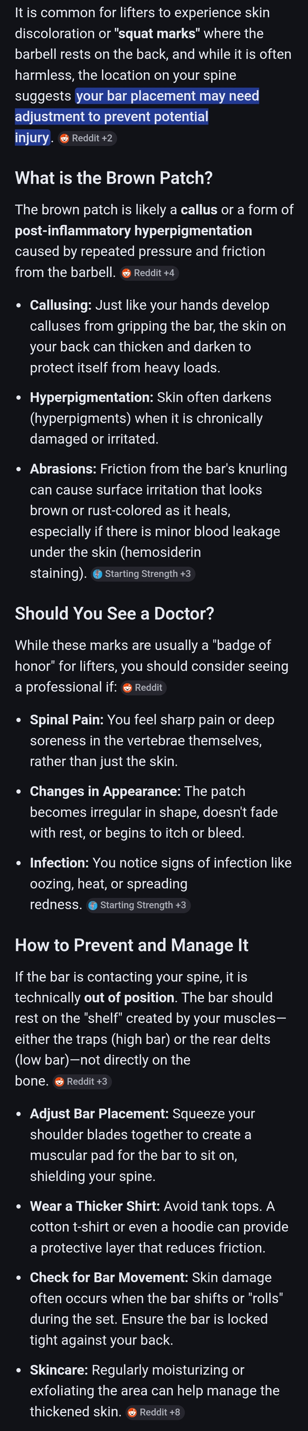 a patch of skin on my back turns brown after i squat, it's the skin where the bar has contact with my spine, if i dont back squat for about 2 weeks it turns white again and no, it's not a bruise, should i go see a doctor?Phase connect