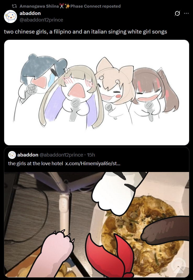 ▼ Phase Connect LinksOfficial Website: https://phase-connect.comOfficial Schedule: https://schedule.phase-connect.comOfficial Twitter: https://x.com/PhaseConnect | https://x.com/PhaseConnectJPOfficial Character References: https://rentry.org/pcgreferencesOfficial Twitch Archive Channels: https://rentry.org/pcgtwitcharchiveUnofficial Phase Connect Archives: https://rentry.org/pcgunofficialarchive––––––––––––––––––––––––––––––––––◆【Lia】https://x.com/rinkouashelia | https://youtube.com/RinkouAshelia | https://twitch.tv/asheliarinkou◆【Utatane Nasa】転寝ナサ (JP) https://x.com/UtataneNasa | https://youtube.com/UtataneNasa | https://twitch.tv/utatanenasa◆【Hakushika Iori】白鹿いおり (JP + EN) https://x.com/hakushikaiori | https://youtube.com/HakushikaIori | https://twitch.tv/iorihakushika◆【Fujikura Uruka】https://x.com/fujikurauruka | https://youtube.com/FujikuraUruka | https://twitch.tv/fujikurauruka◆【Shisui Michiru】紫翠みちる (JP) https://x.com/shisuimichiru | https://youtube.com/ShisuiMichiru | https://twitch.tv/michiru_shisui◆【Tenma Maemi】https://x.com/tenmamaemi | https://youtube.com/TenmaMaemi | https://twitch.tv/tenma◆【Pipkin Pippa】https://x.com/pipkinpippa | https://youtube.com/PipkinPippa | https://twitch.tv/pippa––––––––––––––––––––––––––––––––––◆【Kaneko Lumi】https://x.com/kaneko_lumi | https://youtube.com/KanekoLumi | https://twitch.tv/kanekolumi◆【Fuura Yuri】[Terminated] https://x.com/AmarisYuri | Archive: https://youtube.com/@TheNationalFuuraYuriArchive◆【Dizzy Dokuro】https://x.com/dizzydokuro | https://youtube.com/@dizzydokuro | https://twitch.tv/dizzydokuro◆【Jelly Hoshiumi】https://x.com/jellyhoshiumi | https://youtube.com/@jellyhoshiumi | https://twitch.tv/jellyhoshiumi◆【Ember Amane】https://x.com/emberamane | https://youtube.com/@EmberAmane | https://twitch.tv/emberamane◆【Clio Aite】https://x.com/ClioAite | https://youtube.com/@ClioAite | https://twitch.tv/clioaite◆【MariMari_en】https://x.com/MARIMARI_EN | https://youtube.com/@MARIMARI_EN | https://twitch.tv/marimari_en◆【Eepy Sleepy】https://x.com/EepySleepyCh | https://youtube.com/@EepySleepyCh | https://twitch.tv/EepySleepy––––––––––––––––––––––––––––––––––◆【Remilia Nephys】https://x.com/Remilia_Nephys | https://youtube.com/RemiliaNephys | https://twitch.tv/remilianephys◆【Chisaka Airi】https://x.com/ChisakaAiri | https://youtube.com/ChisakaAiri | https://twitch.tv/chisakaairi◆【Amanogawa Shiina】https://x.com/AmanogawaShiina | https://youtube.com/AmanogawaShiina | https://twitch.tv/amanogawashiina◆【Himemiya Rie】https://x.com/HimemiyaRie | https://youtube.com/HimemiyaRie | https://twitch.tv/himemiyarie◆【Erina Makina】https://x.com/ErinaMakina | https://youtube.com/ErinaMakina | https://twitch.tv/erinamakina◆【Komachi Panko】https://x.com/komachipanko | https://youtube.com/KomachiPanko | https://twitch.tv/komachipanko––––––––––––––––––––––––––––––––––◆【Runie Ruse】https://x.com/RunieRuse | https://youtube.com/@RunieRuse | https://twitch.tv/RunieRuse◆【Eimi Isami】https://x.com/eimiisami | https://youtube.com/@eimiisami | https://twitch.tv/eimiisami◆【Muu Muyu】https://x.com/Muu_Muyu | https://youtube.com/@MuuMuyu | https://twitch.tv/MuuMuyu◆【Hikanari Hina】https://x.com/HikanariHina | https://youtube.com/@HikanariHina | https://twitch.tv/HikanariHina◆【Saya Sairroxs】[Phase Citizen] https://x.com/sayasairroxs | https://youtube.com/@sayasairroxs | https://twitch.tv/sayasairroxs––––––––––––––––––––––––––––––––––◆【Kannagi Loki】巫ロキ (JP) https://x.com/kannagiloki | https://youtube.com/@kannagiloki◆【Kokoromo Memory】[Phase Citizen] https://x.com/kokoromomemory | https://youtube.com/@kokoromomemory_ | https://twitch.tv/kokoromomemory◆【Gram Pico】倉夢ぴこ (JP) https://x.com/grampico_ | https://youtube.com/@grampico | https://twitch.tv/grampico◆【Ayase Yuu】絢世ユウ (JP) https://x.com/ayaseyuuu | https://youtube.com/@ayaseyuu | https://twitch.tv/ayaseyuu_◆【Kaminari Clara】[Graduated] https://x.com/kaminariclara_ | https://youtube.com/@kaminariclara | https://twitch.tv/kaminariclara––––––––––––––––––––––––––––––––––◆【Malice Evermore】https://x.com/MaliceEvermore | https://youtube.com/@maliceevermore | https://twitch.tv/maliceevermore◆【Nitya Nil】https://x.com/Nitya_Nil | https://youtube.com/@Nitya_Nil | https://twitch.tv/nitya_nil◆【Wilhelmina Frost】https://x.com/wilhelminafr0st | https://youtube.com/@wilhelminafrost | https://twitch.tv/wilhelminafrost◆【Bibi Biscuit】https://x.com/BibiBiscuitCh | https://youtube.com/@bibibiscuitch | https://twitch.tv/bibibiscuitch◆【Anya Nyabyss】https://x.com/AnyaNyabyss | https://youtube.com/@AnyaNyabyss | https://twitch.tv/anyanyabyss◆【Sinon Sinfonia】https://x.com/SinonSinfonia | https://youtube.com/@SinonSinfonia | https://twitch.tv/sinonsinfoniaPrevious thread: >>110882954