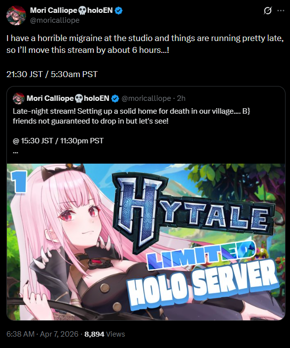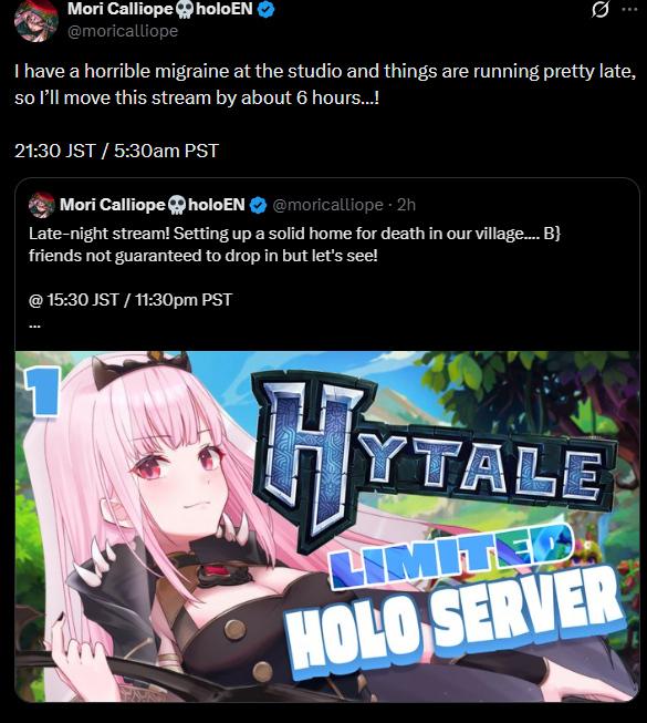 Kiara won't be playing hytale until after her collab with gigi so mori will probably be alone today and shiori already has a different stream schedule so it will just be gigi and kiara