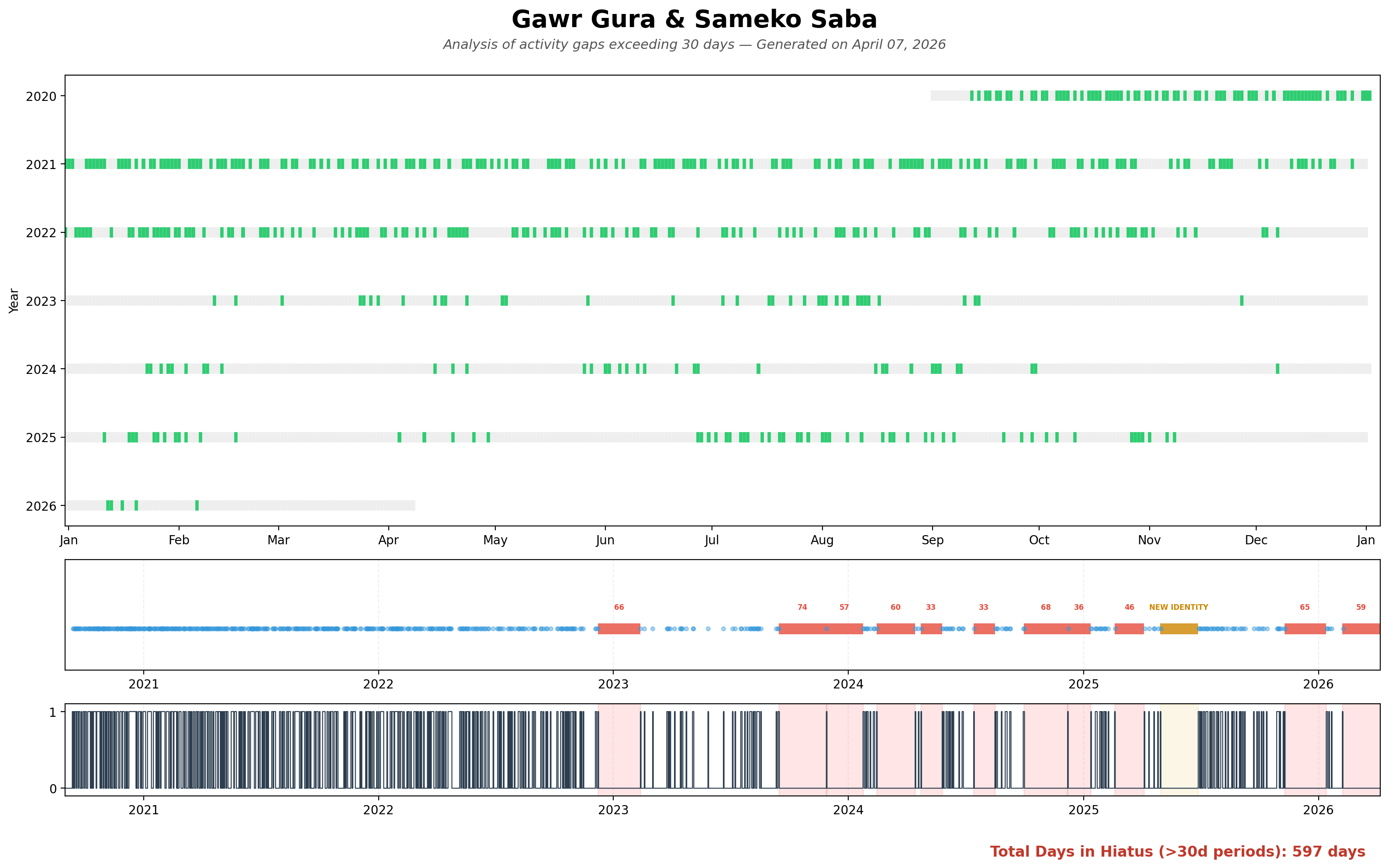 all breaks over 30 days, MM/DD/YY>saba02/07/26 - ongoing (58d)11/09/25 - 01/13/26 (65d)>gura02/18/25 - 04/05/25 (75d)12/07/24 - 01/12/25 (36d)09/30/24 - 12/07/24 (68d) - ends with a single member stream, 104d combined07/14/24 - 08/16/24 (33d)04/23/24 - 05/26/24 (33d)02/18/24 - 04/14/24 (55d)09/14/23 - 11/28/23 (75d)12/08/22 - 02/12/23 (66d)