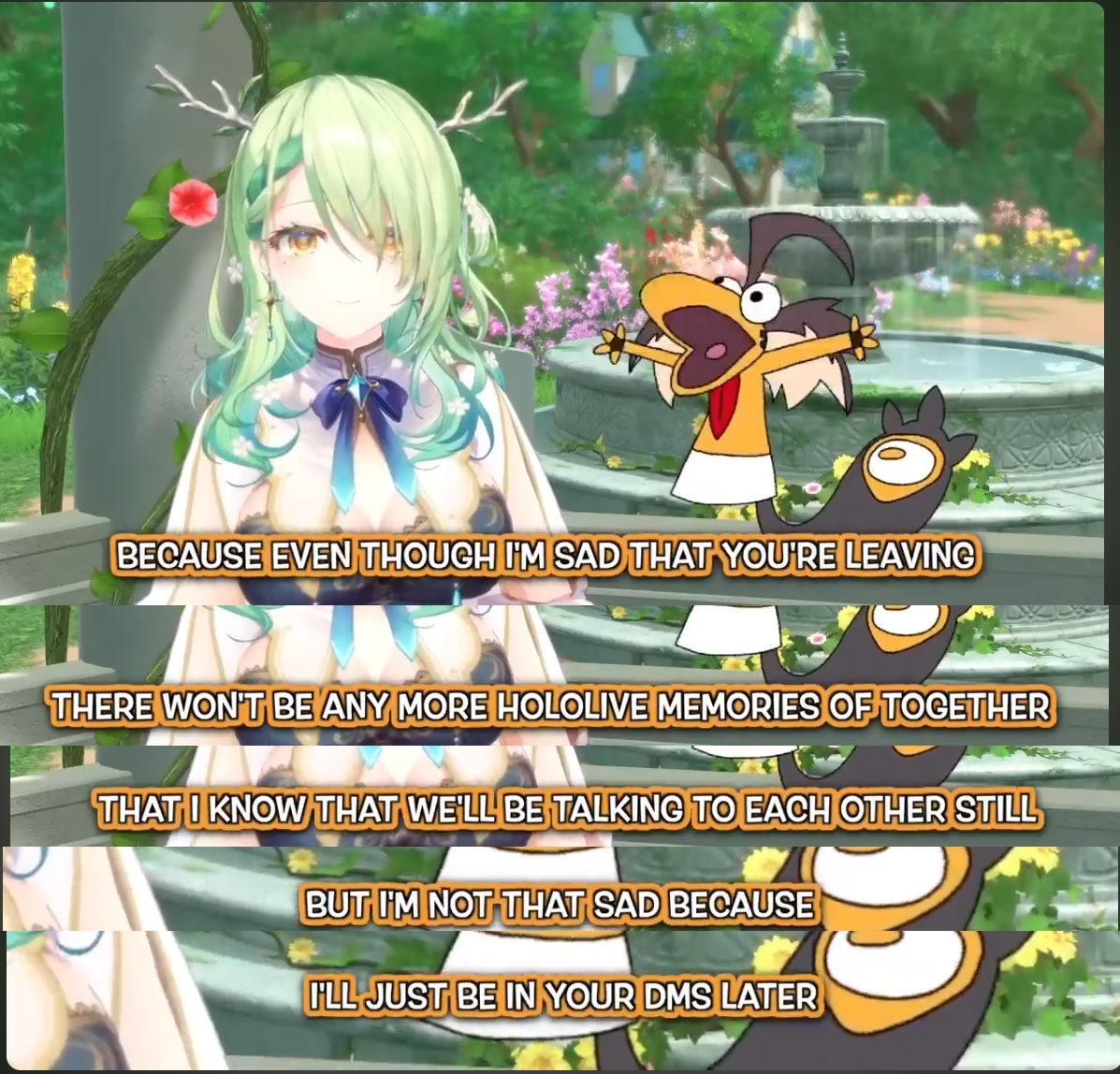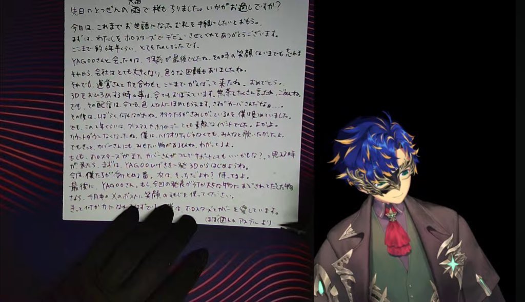 >Hi Management and YAGOO,>The big downpour made a mess of the cherry blossom petals too.>Today, I would like to write a letter to express my gratitude for everything you have done for me so far.>Thanks for letting me debut as Holostars for the past 6 and half years.>The last time I had met Yagoo was 4 and a half years ago, and I still remember his smile that day.>The company has become pretty big, and many tough things did happened.>But even so, with the help of working with the management, I had made it to now. Congratulations!>I still remember when I first debut with 3D. I'm sorry if I had made many unreasonable requests.>But even now, that broadcast still gets praised by many people. That's typical of Cover.>Nothing happened for a while, and I watched the fans feeling very lonely.>However, for the last 2 years, with white days and Christmas, it is a great time.>The countdown is gone, and I wanted to sing with everyone, even if it isn't high-quality.>But I'm sure Cover has something to show you too, I know.>If the day ever comes when Cover feels like they can fully support Holostars again, let’s start with a 3D version of “YAGOO Mustache Pop,” okay?>Now it’s our turn to receive and support you. Next time, it’s your turn, right? We’ll be waiting.>And finally, YAGOO, if this announcement was made under pressure from some powerful entity, please use a smiling emoji in your post sometime in April.>I'm sure I can become something, and I love Hololive and Cover.>Almost entirely personal, Astel