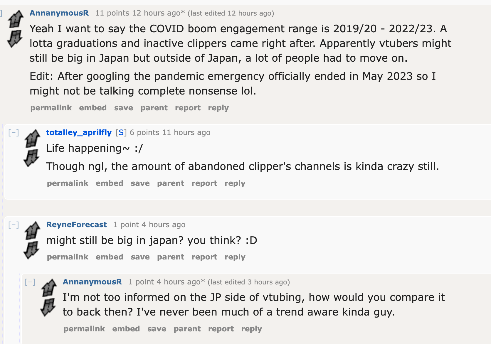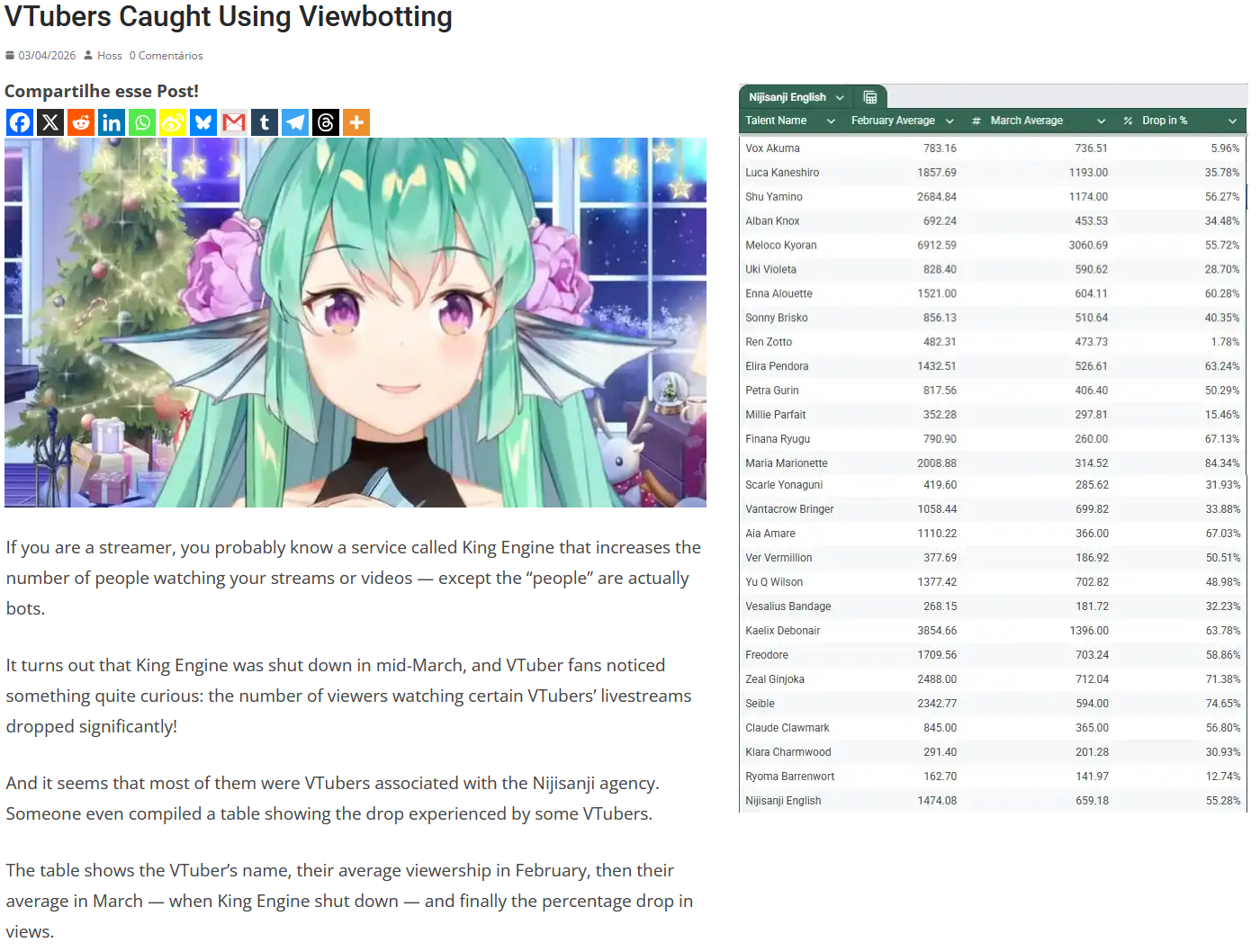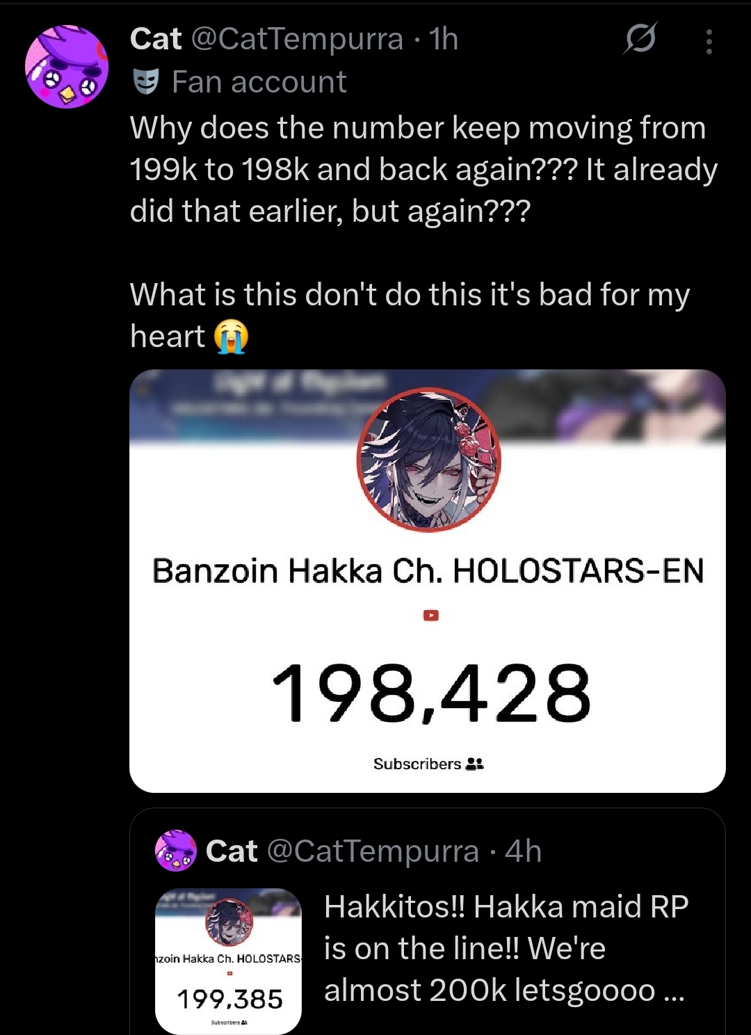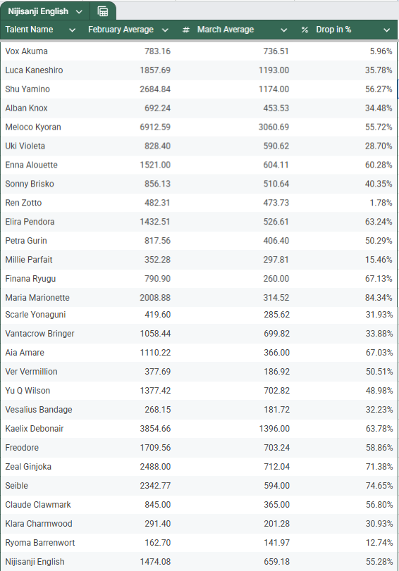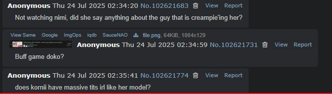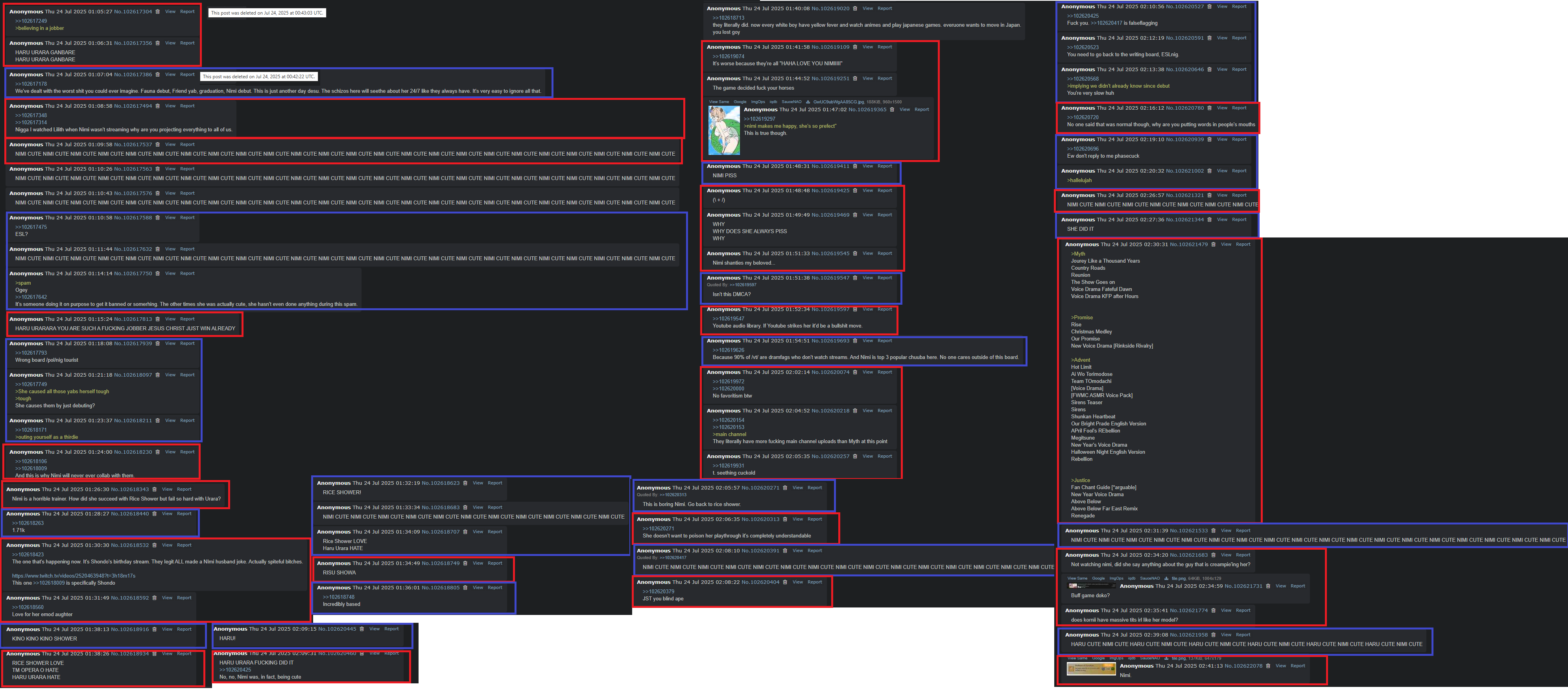 I woke up thinking that /#/ would have at least 5 threads with bump limit on the catalog. /vt/ sure has fallen, eh? Anyway, for zero surprises, the Nijisanji bot supplier got nuked. Check Nimi, Mint and Phase whores recent numbers to see if they use the same bot provider.