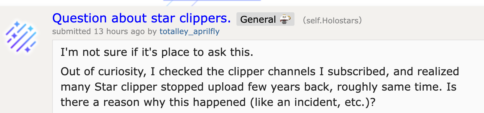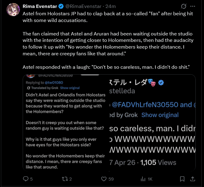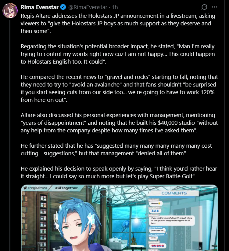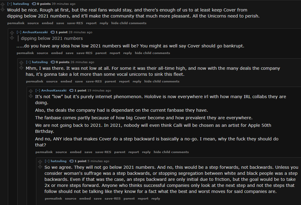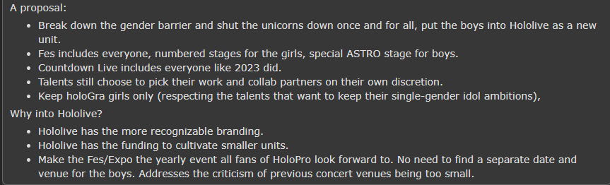 >>110897375>https://reddit.com/r/Holostars/comments/1sf0xmz/what_if/>Well?Yagoo was never quite willing to add guys to Hololive since it would do major damage to merch sales. He certainly wouldn't do anything this extreme after making budget cuts to Holostars. The cultural warriors that hate Japanese idols are ignoring the financial reality of the Hololive business model. To severly reduce CGDCT content so Hololive becomes another Nijisanji would do even more damage than HoloEarth.The anons that want to combine Holostars into Hololive either don't understand why adding guys to Holofes is a bad idea or their main goal is hurting unicorns and they don't care how much it would financially hurt Cover. The Reddit Mod desperately asking fans to stop reporting joemelonyeah for making that thread is hilarious. Maybe the suggestion to combine them was sincere but it might as well be trolling for 99% of Hololive fans. If they don't lock that thread in the next day it will be curious how many hundreds of posts will get deleted.>>110899306>I find it funny when homosisters say Vesper and Magni destroyed Holostars chance of success.Cover fired them before the first Tempus anniversary and the SALT collabs were the most successful HoloPro collabs in the EN branch. That continues to be true even in 2026. Yagoo was an idiot for letting an easy to fix redesign dispute end with 2 "graduations" and that was likely the best chance he ever got for HoloPro unity.