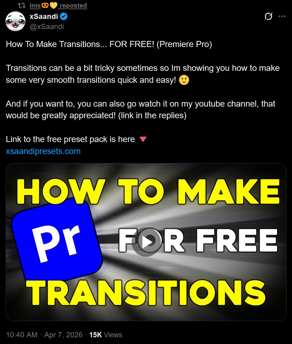 Inis' video editor is putting out a series of tutorials on how to edit videos and how to use the free preset packs he released for Premiere Pro. For anyone who wants to learn video editing, this seems like a good place to starthttps://x.com/xSaandi/status/2041526502534037826https://www.youtube.com/@xSaandiEditing