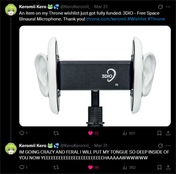 >>110918004There's not even porn here anymore.>>110918000Witnessed. I told her her audio is perfectly fine, and that I knew it was gonna get even better with the 3Dio.