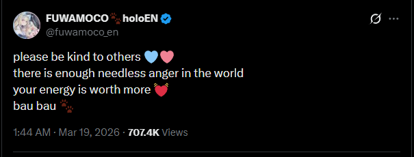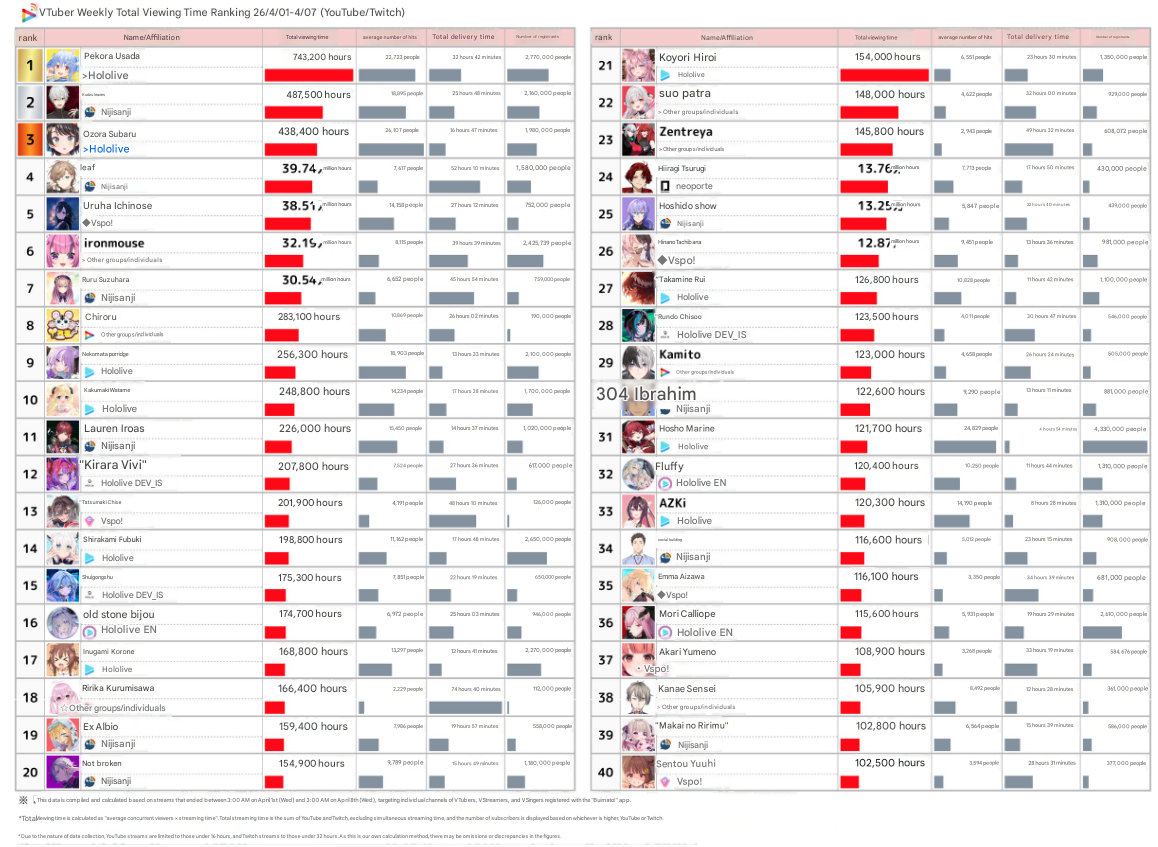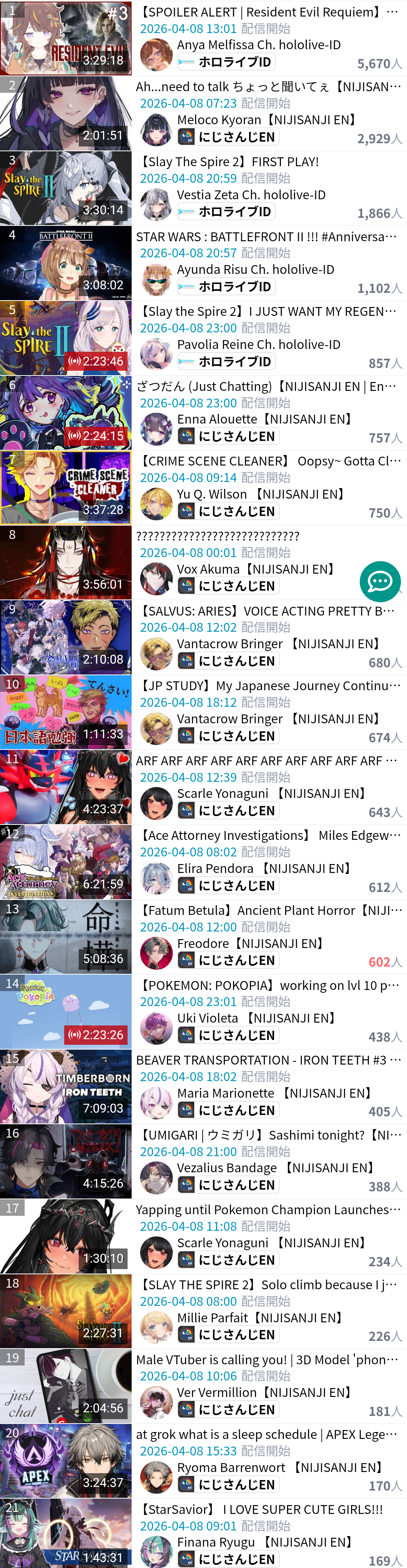 *APRIL 8TH 2026 FINAL EN TALLY*>9,808: FUWAMOCO (<3) (Hololive English)>9,402: Gigi (Hololive English)>7,178: IRyS (Hololive English)>6,229: Bijou (Hololive English)>5,932: Kiara (Hololive English)Not too shabby at all. Gold for Fuwawa and Mococo Abyssgard with Chrono Trigger part 2 alongside Cecilia, Silver for Gigi Murin's playthrough of the Hytale HoloEN/ID Server, Bronze for Hoozuki IRyS' playthrough of Resident Evil 6 alongside Bijou.HONORABLE OFF-TALLY MENTION: >5,670: Anya Melfissa (Hololive Indonesia)>RANKING PER POINTS (Gold = 3, Silver = 2, Bronze = 1)Calliope = 11pFUWAMOCO = 10pGigi = 9pCecilia = 5pHololive English, Bijou = 3pKiara, Kronii = 2p[IRyS, Baelz], Nimi = 1p