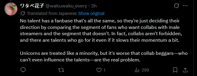 >>110925510>they can be vulgar and dumbBecause we don't really care about that, there is nothing on the different unicorn definitions that says that you have to moderate your language or anything like that.But it's a zero sum game. If you homocollab it's over, anything you did over the past is suddenly worthless, or worse, revisioned. Only Mori and Kronii have recovered their reputation but that was shock therapy more than anything