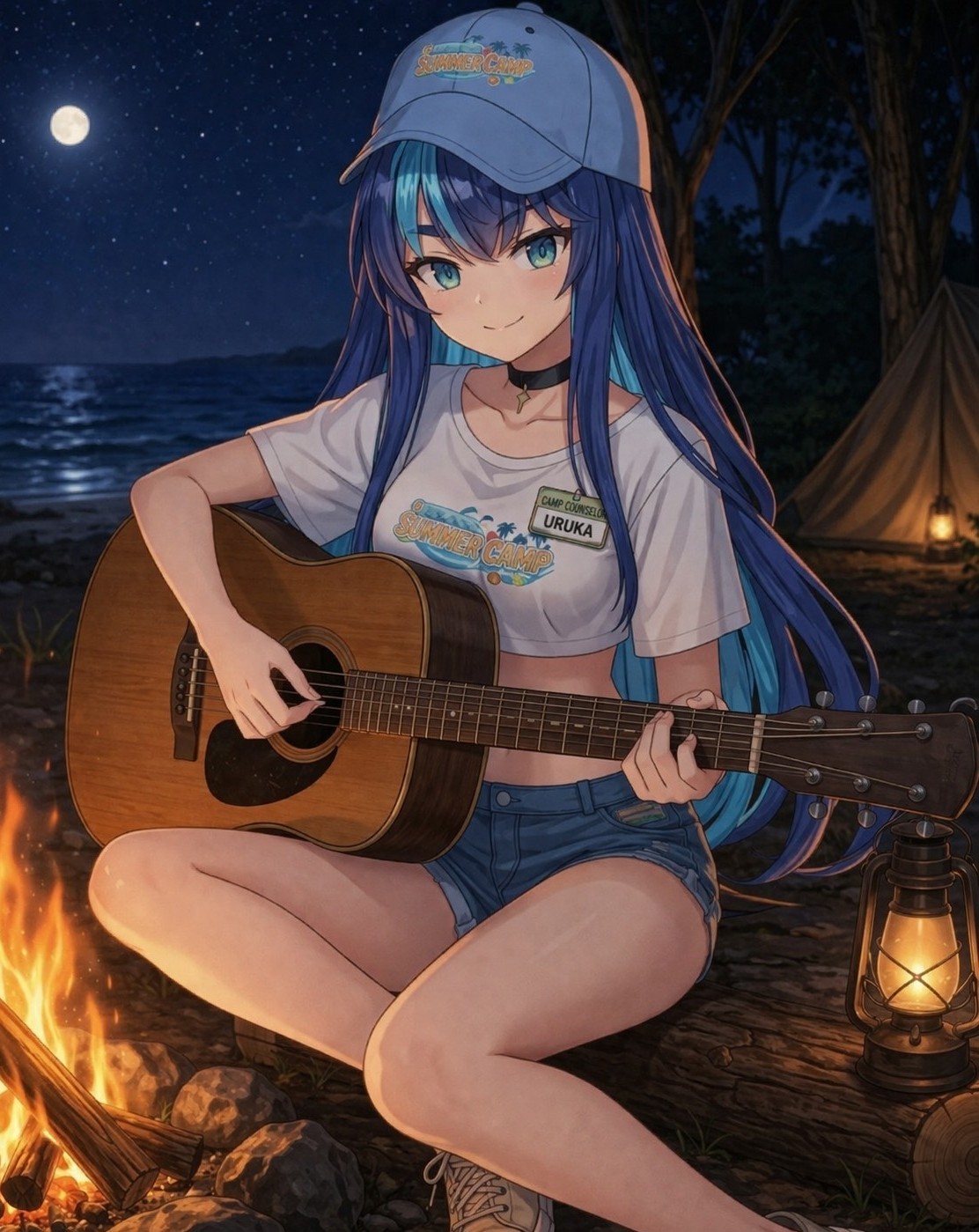 Day 3 at Phase Camp>Lumi kicks you out of the cabin l, something about "get your cute butt over to the campfire" >Your red face marches over to the campgrounds>You finally get settled with your new camp mates, who you shyly dont speak to>You hear the strum of a guitar>The blue haired camp counselor is sitting across from you, smiling with a warm kindness>"Ready to sing some songs?" she says in a husky voice