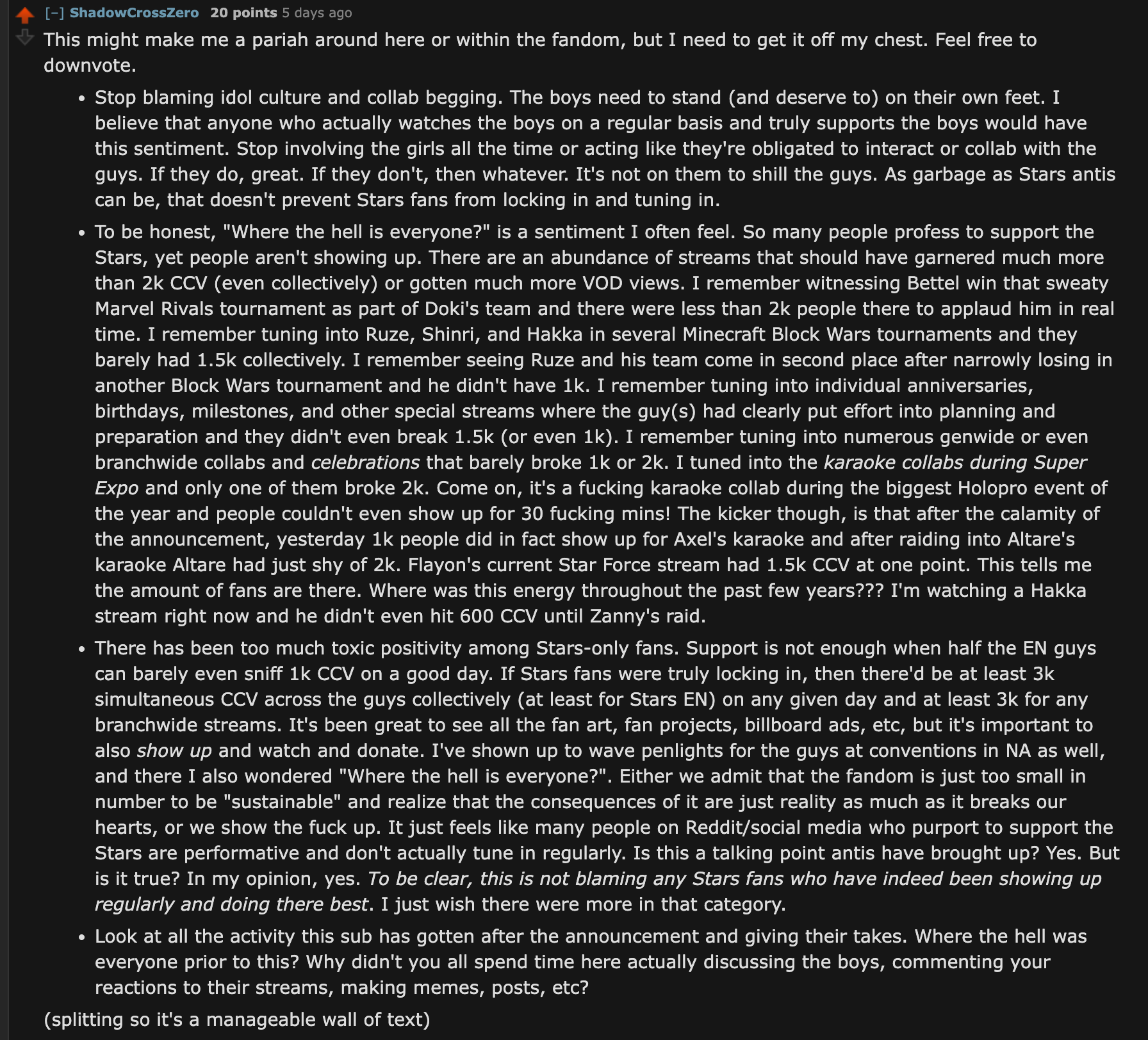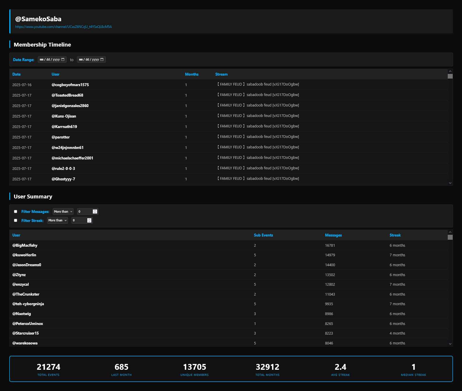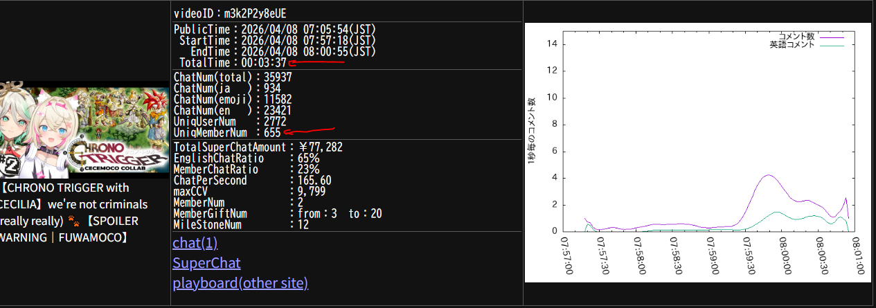 >>110969739No? What kind of serious information do you expect to get from *one* stream when different streams attract different amount of viewers / members?Then we have the matter of duration: longer streams likely get more messages from members (since there are more time for members to participate), but it's just "likely", not a guarantee and it doesn't scale (i.e: a 6 hours long stream doesn't necessarily gets more unique members than a 5 hours long one, from the same streamer)