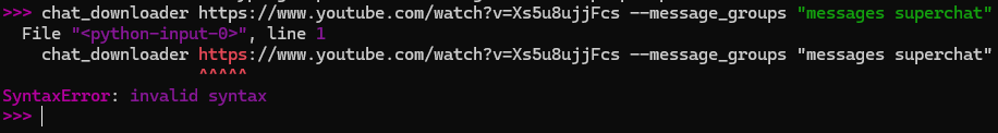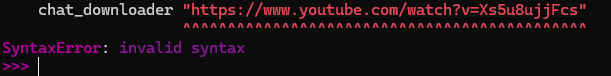 >>110969581Huh, that looks the same as what I used to get my chat fileschat_downloader https://www.youtube.com/watch?v=LgzLICLnVEM --cookies "f:/chat-downloader/cookies.txt" --message_groups "messages superchat" --output "F:\chat-downloader\IRyS Nov/IRyS_16Nov.json"(just dug it up from my old folder project). I believe I installed it and then just run it through command prompt / a .bat file, though.