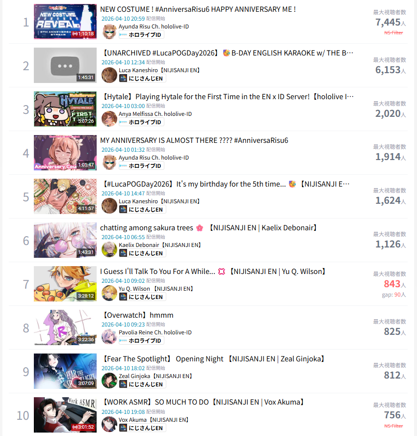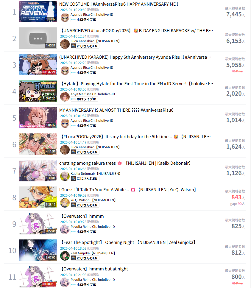 UNIQUE MEMBER CHATTERS ON THEIR LAST STREAM>Koseki Bijou: 831>Ouro Kronii: 823>Cecilia Immergreen: 799>Mori Callioe: 717>Nimi Nightmare: 709>IRyS: 688>Gigi Murin: 679>FUWAMOCO: 675>Takanashi Kiara: 579>Raora Panthera: 547>Nerissa Ravencroft: 511 (I skipped the actual last stream which was sponsored, thus it was unreasonably low at 286. This is her penultimate stream.)>Hakos Baelz: 460>Elizabeth Rose Bloodflame: 459>Shiori Novella: 425What information can we take from this?
