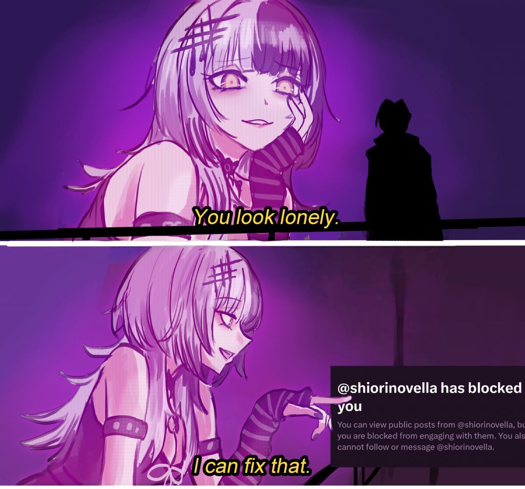 >>110969814People will give you a ton of reasons that sound logical and reasonable but none of those are the truth.In reality, people dislike Shiori because she's a loser. She's a loser on a level even worse than her vtubing peers. She's a loser on a level even worse than the average /vt/ denizen. Shiori is the type of girl you see in high school that makes you think, "at least I'm not her", because you had like, two friends you could geek out with, or you were friendless but people left you alone with your hobbies, or school was tough but at least you'd go home and hop on the internet and have fun.Shiori is the absolute bottom of the social ladder. It doesn't go lower than her. /vt/ dislikes her because we instinctively understand that she's such a loser that you'd look bad associating with her as a novellite.