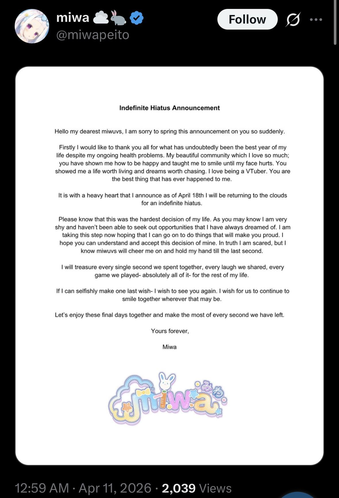 >>110990994Yeah, last week.*APRIL 2ND 2026 FINAL EN TALLY*>19,289: FUWAMOCO (<3) (Hololive English)>10,387: Cecilia (Hololive English)>10,175: Gigi (Hololive English)>9,583: Nimi (Indie)>9,487: Cecilia (Hololive English)>7,748: Dokibird (Indie)>6,307: Bijou (Hololive English)>6,083: IRyS (Hololive English)>5,483: FUWAMOCO (<3) (Hololive English)>5,115: Shiori (Hololive English)