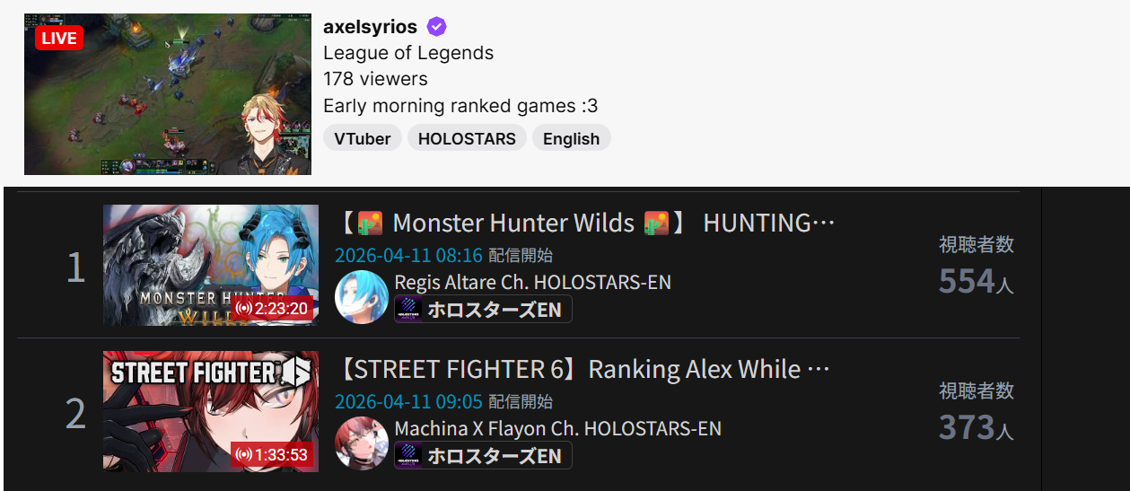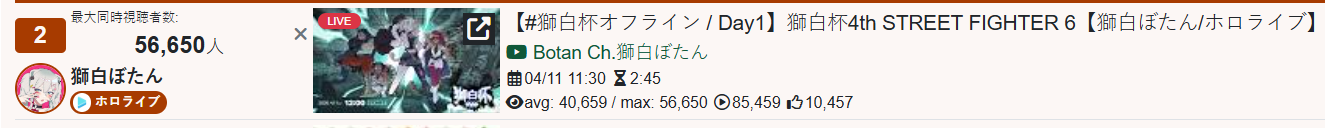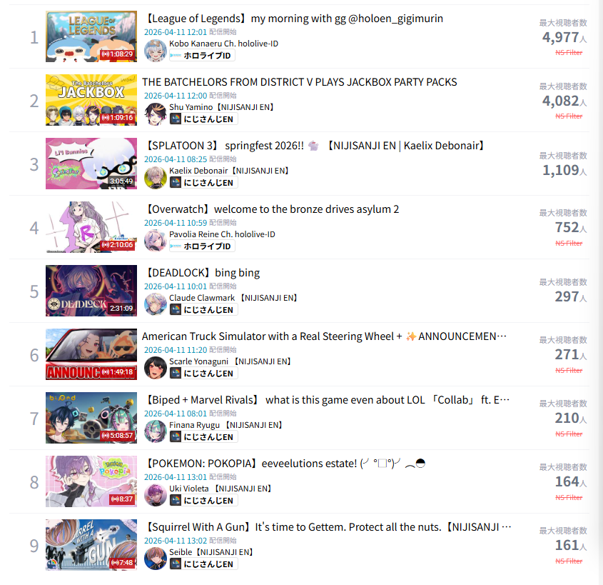 >>110990152MAR 2026 SILVER>1) 50,543: Nijisanji (nijisanji) Niji air riders fes>2) 39,195: Miko (hololive) BIOHAZARD requiem #3>3) 40,125: Miko (hololive) SoraMiko collab>4) 32,076: Subaru (hololive) Super Mario World #6>5) 30,989: Kuzuha (nijisanji) NijiZoff>6) 37,404: Hololive (hololive) holofes day1>7) 53,057: Hololive (hololive) holofes STAGE2 DAY2 free part>8) 59,748: Hololive (hololive) holofes STAGE4 DAY3 free part>9) 27,779: Miko (hololive) Pokemon FireRed>10) 35,457: Subaru (hololive) Mario Tennis Fever w/ Okayu>11) 29,892: Kuzuha (nijisanji) APEX>12) 32,136: Anya (hololive) 3D BIRTHDAY LIVE>13) 27,699: Kuzuha (nijisanji) APEX>14) 44,158: Nijisanji (nijisanji) Niji Apex 2026>15) 47,528: Koyori (hololive) Birthday Totsumachi>16) 36,233: Kou (nijisanji) niji pokemon 1on1 battle>17) 36,165: Subaru (hololive) Pokemon Pokopia>18) 33,052: Subaru (hololive) Super Mario World #7>19) 26,525: Ayame (hololive) 誰かの心霊写真 w/ Fubuki>20) 33,496: Koyori (hololive) 3D momotetsu w/ Chihaya, Korone, Polka>21) 35,772: IRyS (hololive) 3D LIVE Birthday>22) 115,649: VSPO (VSPO) VSPO! SHOWDOWN 2026 DAY2>23) 31,599: Miko (hololive) Pokemon FireRed #9>24) 56,411: Miko (hololive) miComet advice corner>25) 44,042: Pekora (hololive) slots>26) 32,489: Subaru (hololive) Pokemon Pokopia>27) 34,486: Vivi (hololive) gyakutotsu + announcement>28) 37,713: Miko (hololive) 1on1 collab w/ Akami Karubi>29) 54,635: Chaika (nijisanji) new 3D reveal>30) 16,567: Mio (hololive) AsaMio>31) 39,917: Miko (hololive) break announcement> PER COMPANY7x: nijisanji23x: hololive1x: VSPO> PER STREAMER7x: Miko5x: Subaru3x: Hololive, Kuzuha2x: Nijisanji, Koyori1x: Anya, Kou, Ayame, IRyS, VSPO, Pekora, Vivi, Chaika, Mio