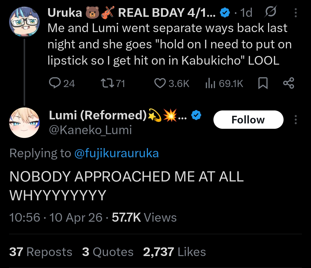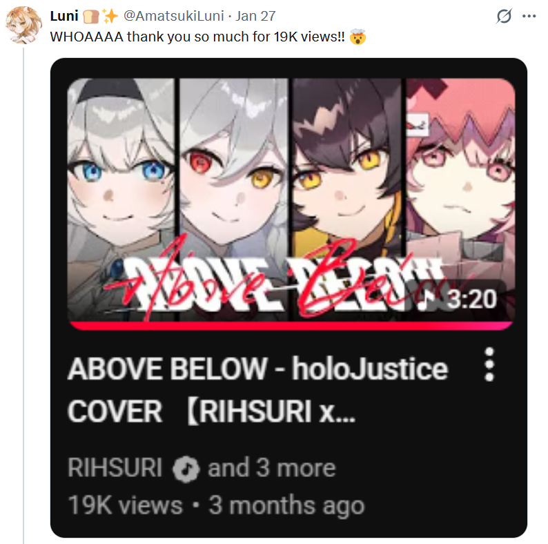 >>110997028>56k on just the free part>which means total viewership is likely more than 100kKuzuha still won, most niji fans were watching on ABEMA.