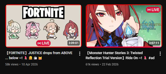>>110989673MAR 2026 GOLD>1) 52,306: Akairo Mia (Brave Group) NEWTOWN clipshow [24]>2) 81,490: Nene (hololive) 3D Live Birthday [19]>3) 40,481: Miko (hololive) Biohazard requiem FINALE [21]>4) 66,856: Miko (hololive) gyakutotsu in Live2D [15]>5) 169,066: Miko (hololive) 3D LIVE Birthday [14]>6) 64,838: Hololive (hololive) holofes STAGE1 DAY1 free part [13]>7) 56,710: Hololive (hololive) holofes STAGE3 DAY2 free part [18]>8) 108,227: Kuzuha (nijisanji) kanji de GO! + announcement [22]>9) 46,398: Elu (nijisanji) Niji Apex fes 2026 team & rules announcement [23]>10) 45,512: Marine (hololive) Mario Tennis Cup [23]>11) 70,976: Pekora (hololive) Holo Mario Tennis Cup matchups [17]>12) 45,192: Okayu (hololive) Mario Tennis totsumachi [18]>13) 42,696: Subaru (hololive) Mario Tennis practice totsumachi [22]>14) 46,807: Kronii (hololive) 3D Birthday Live + New Outfit [24]>15) 184,450: Pekora (hololive) Hololive Mario Tennis Cup [21]>16) 43,711: Pekora (hololive) Hololive Mario Tennis Cup clipshow [18]>17) 72,610: Shellin Burgundy (nijisanji) 8th niji mario kart tournament [15]>18) 38,736: Popo (774 inc) NEWTOWN lookback [18]>19) 34,145: Subaru (hololive) Subaru's Cabin ft. Hajime [14]>20) 158,104: Lunlun (nijisanji) 3D reveal [22]>21) 109,611: VSPO (VSPO) VSPO! SHOWDOWN 2026 DAY1 [22]>22) 155,694: Suisei (hololive) 8th anniversary LIVE [25]>23) 49,321: Lize (nijisanji) NijiPoke1on1 [15]>24) 57,462: Subaru (hololive) SubaOka watching hololive official videos [22]>25) 44,327: Miko (hololive) Nenechi Mikochi [20]>26) 37,002: Shigure Ui (indie) stream ends when Watame tweets [19]>27) 41,934: Miko (hololive) Pokemon FireRed FINALE [20]>28) 73,460: Koyori (hololive) 3D LIVE new 3D + important announcement [28]>29) 122,348: Subaru (hololive) 7th anniversary 3D LIVE [25]>30) 20,454: Fuwamoco (hololive) LEAGUE OF LEGENDS [9]>31) 87,811: Miko (hololive) fake fuwawa audition [18]> PER COMPANY1x: Brave Group22x: hololive5x: nijisanji1x: 774 inc1x: VSPO1x: indie> PER STREAMER6x: Miko4x: Subaru3x: Pekora2x: Hololive1x: Akairo Mia, Nene, Kuzuha, Elu, Marine, Okayu, Kronii, Shellin Burgundy, Popo, Lunlun, VSPO, Suisei, Lize, Shigure Ui, Koyori, Fuwamoco