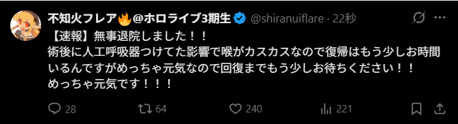 >>110997165 (me)oh wait sorry misread the tweet>her voice is still recovering because they put her on an artificial respirator during surgery