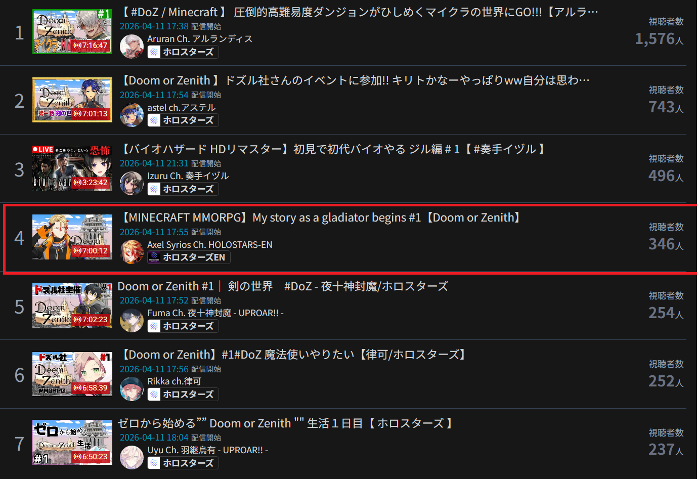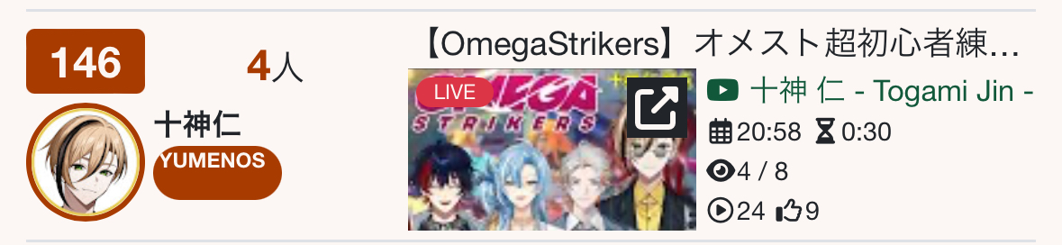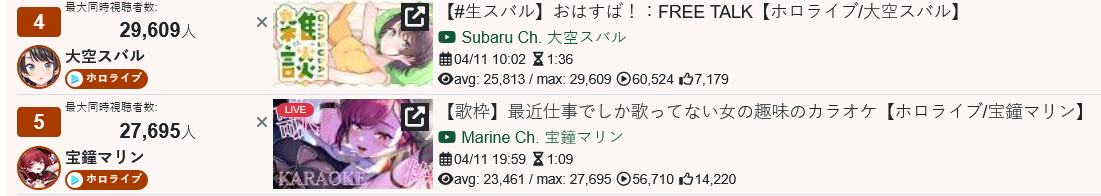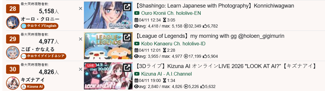 >>111001995MAR 2026 GOLD>1) 52,306: Akairo Mia (Brave Group) NEWTOWN clipshow [24]>2) 81,490: Nene (hololive) 3D Live Birthday [19]>3) 40,481: Miko (hololive) Biohazard requiem FINALE [21]>4) 66,856: Miko (hololive) gyakutotsu in Live2D [15]>5) 169,066: Miko (hololive) 3D LIVE Birthday [14]>6) 64,838: Hololive (hololive) holofes STAGE1 DAY1 free part [13]>7) 56,710: Hololive (hololive) holofes STAGE3 DAY2 free part [18]>8) 108,227: Kuzuha (nijisanji) kanji de GO! + announcement [22]>9) 46,398: Elu (nijisanji) Niji Apex fes 2026 team & rules announcement [23]>10) 45,512: Marine (hololive) Mario Tennis Cup [23]>11) 70,976: Pekora (hololive) Holo Mario Tennis Cup matchups [17]>12) 45,192: Okayu (hololive) Mario Tennis totsumachi [18]>13) 42,696: Subaru (hololive) Mario Tennis practice totsumachi [22]>14) 46,807: Kronii (hololive) 3D Birthday Live + New Outfit [24]>15) 184,450: Pekora (hololive) Hololive Mario Tennis Cup [21]>16) 43,711: Pekora (hololive) Hololive Mario Tennis Cup clipshow [18]>17) 72,610: Shellin Burgundy (nijisanji) 8th niji mario kart tournament [15]>18) 38,736: Popo (774 inc) NEWTOWN lookback [18]>19) 34,145: Subaru (hololive) Subaru's Cabin ft. Hajime [14]>20) 158,104: Lunlun (nijisanji) 3D reveal [22]>21) 109,611: VSPO (VSPO) VSPO! SHOWDOWN 2026 DAY1 [22]>22) 155,694: Suisei (hololive) 8th anniversary LIVE [25]>23) 49,321: Lize (nijisanji) NijiPoke1on1 [15]>24) 57,462: Subaru (hololive) SubaOka watching hololive official videos [22]>25) 44,327: Miko (hololive) Nenechi Mikochi [20]>26) 37,002: Shigure Ui (indie) stream ends when Watame tweets [19]>27) 41,934: Miko (hololive) Pokemon FireRed FINALE [20]>28) 73,460: Koyori (hololive) 3D LIVE new 3D + important announcement [28]>29) 122,348: Subaru (hololive) 7th anniversary 3D LIVE [25]>30) 20,454: Fuwamoco (hololive) LEAGUE OF LEGENDS [9]>31) 87,811: Miko (hololive) fake fuwawa audition [18]> PER COMPANY1x: Brave Group22x: hololive5x: nijisanji1x: 774 inc1x: VSPO1x: indie> PER STREAMER6x: Miko4x: Subaru3x: Pekora2x: Hololive1x: Akairo Mia, Nene, Kuzuha, Elu, Marine, Okayu, Kronii, Shellin Burgundy, Popo, Lunlun, VSPO, Suisei, Lize, Shigure Ui, Koyori, Fuwamoco