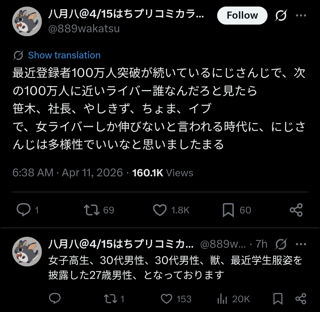 >>111002070>>111002106Actually one can “eyeball” the magnitude of the recline as Nijisanji discloses the numbers per branch. Their current combined livestream revenue is lower than from the days of the “Golden 20” (LOE + LuxNoc) and they have 8 more livers now (lots of attrition in the period, no?)Current total livestream revenue (last quarter) was 153M yen for three months https://ssl4.eir-parts.net/doc/5032/ir_material_for_fiscal_ym3/200355/00.pdfmeaning about 51M yen / month which in current rate means about 320k USD / month which is the total livestream revenue for the branch (ads + donations + membership). That’s the gross revenue and that makes for about 11k USD / liver / month BEFORE either YouTube or the company cut. Assuming Hololive generous disclosed cut (50% of the 70% after YouTube cut, meaning 35%) the average livestreaming take home for a NijiEN liver would be about 3600 USD / month. Not every liver is made equal so you can assume it’s actual a range with 5k / month at the top and 1k / month at the bottom but not much higher than this. That’s is in the assumption Niji gives a 50-50 cut.