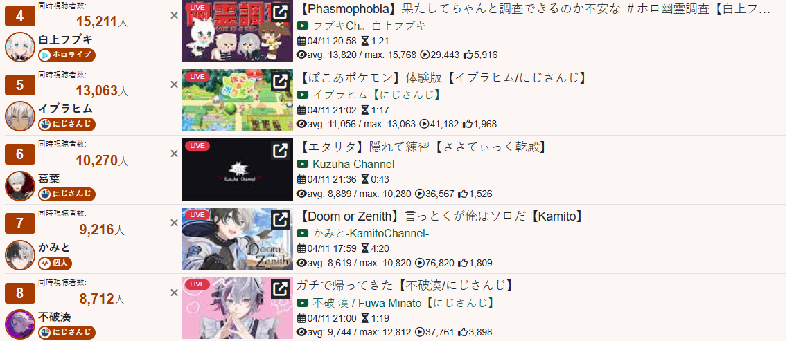 >>111001995* YESTERDAY’S FINAL TALLY * >29,536: Pekora (Hololive)>24,953: Nose (VSPO)>24,777: Chiroru (Indie)>21,423: Pekora (Hololive)>18,849: Korone (Hololive)>17,873: Subaru (Hololive)>16,430: Koyori (Hololive)>16,280: Vivi (Hololive)>13,969: Watame (Hololive)>13,918: Polka (Hololive)>12,519: Shigure Ui (Indie)>12,223: Ex Albio (Nijisanji)