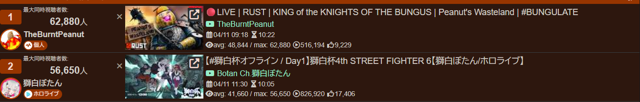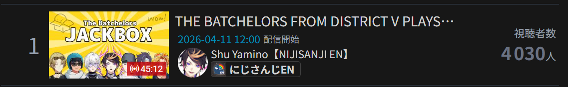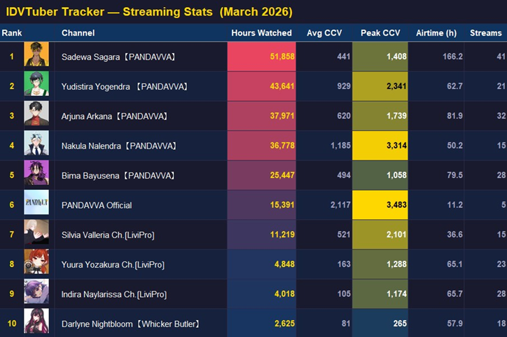>>111003111MAR 2026 SILVER>1) 50,543: Nijisanji (nijisanji) Niji air riders fes>2) 39,195: Miko (hololive) BIOHAZARD requiem #3>3) 40,125: Miko (hololive) SoraMiko collab>4) 32,076: Subaru (hololive) Super Mario World #6>5) 30,989: Kuzuha (nijisanji) NijiZoff>6) 37,404: Hololive (hololive) holofes day1>7) 53,057: Hololive (hololive) holofes STAGE2 DAY2 free part>8) 59,748: Hololive (hololive) holofes STAGE4 DAY3 free part>9) 27,779: Miko (hololive) Pokemon FireRed>10) 35,457: Subaru (hololive) Mario Tennis Fever w/ Okayu>11) 29,892: Kuzuha (nijisanji) APEX>12) 32,136: Anya (hololive) 3D BIRTHDAY LIVE>13) 27,699: Kuzuha (nijisanji) APEX>14) 44,158: Nijisanji (nijisanji) Niji Apex 2026>15) 47,528: Koyori (hololive) Birthday Totsumachi>16) 36,233: Kou (nijisanji) niji pokemon 1on1 battle>17) 36,165: Subaru (hololive) Pokemon Pokopia>18) 33,052: Subaru (hololive) Super Mario World #7>19) 26,525: Ayame (hololive) 誰かの心霊写真 w/ Fubuki>20) 33,496: Koyori (hololive) 3D momotetsu w/ Chihaya, Korone, Polka>21) 35,772: IRyS (hololive) 3D LIVE Birthday>22) 115,649: VSPO (VSPO) VSPO! SHOWDOWN 2026 DAY2>23) 31,599: Miko (hololive) Pokemon FireRed #9>24) 56,411: Miko (hololive) miComet advice corner>25) 44,042: Pekora (hololive) slots>26) 32,489: Subaru (hololive) Pokemon Pokopia>27) 34,486: Vivi (hololive) gyakutotsu + announcement>28) 37,713: Miko (hololive) 1on1 collab w/ Akami Karubi>29) 54,635: Chaika (nijisanji) new 3D reveal>30) 16,567: Mio (hololive) AsaMio>31) 39,917: Miko (hololive) break announcement> PER COMPANY7x: nijisanji23x: hololive1x: VSPO> PER STREAMER7x: Miko5x: Subaru3x: Hololive, Kuzuha2x: Nijisanji, Koyori1x: Anya, Kou, Ayame, IRyS, VSPO, Pekora, Vivi, Chaika, Mio