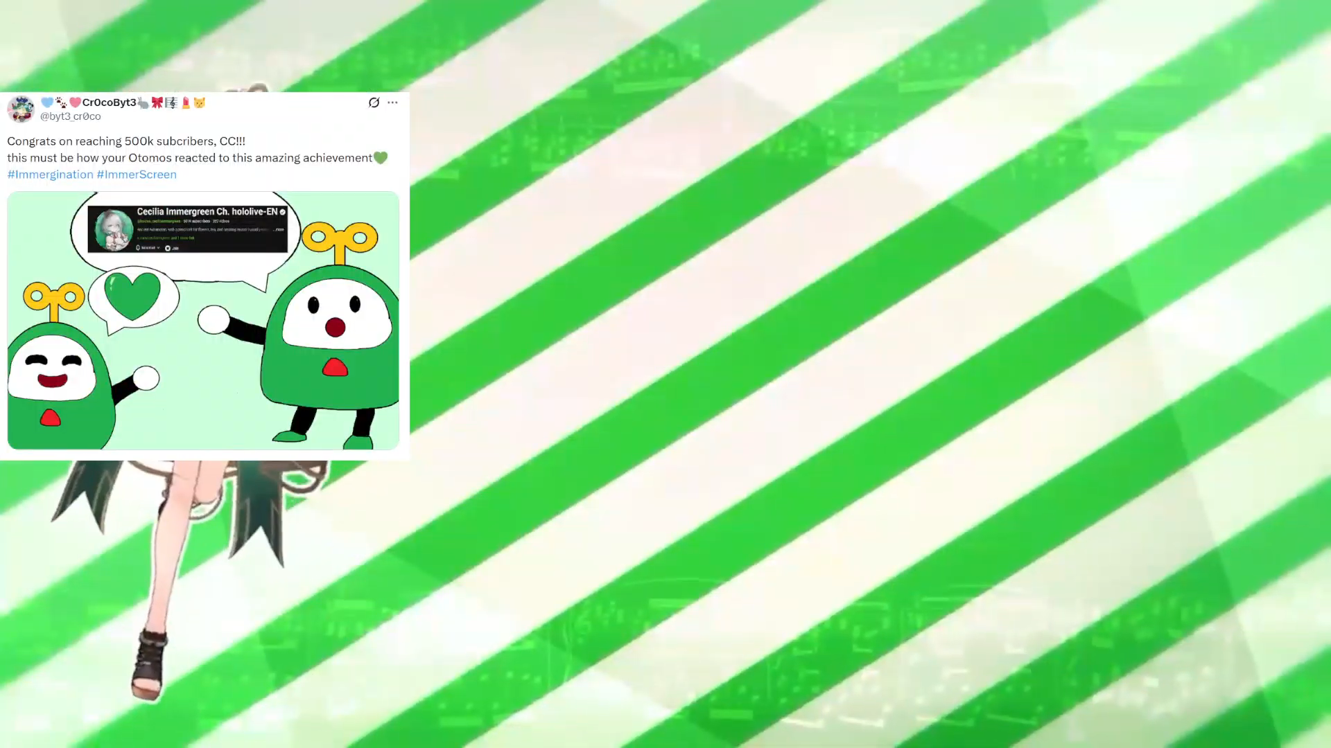 The 753rd Wind>NEXT STREAM: 【Marvel’s Spider-Man】500K SUBSCRIBERS CELEBRATION!https://www.youtube.com/watch?v=44xv1WXRviw>LAST STREAM: 【CHRONO TRIGGER with CECILIA】saving the world from disaster (true story) 【SPOILER WARNING|FUWAMOCO】https://www.youtube.com/watch?v=4uJOnFvW2hk>Links:YouTube: https://www.youtube.com/@holoen_ceciliaimmergreenTwitter: https://twitter.com/ceciliaimgreenImportant Videos: https://rentry.org/ImmerMarks>Music:https://rentry.org/ImmerPiece【Hololive EN Justice】ABOVE BELOW- https://www.youtube.com/watch?v=ilLEj-SCCn8【Cover】 Forgotten Words | 忘れじの言の葉 #歌ってみた - https://www.youtube.com/watch?v=twto2g0FwTQ【Hololive EN】Odyssey - https://www.youtube.com/watch?v=0wO8d70KSXw【ENReco Orisong】Oh Princess - https://www.youtube.com/watch?v=5x9ix5CGmoo【CCGG Cover】Naimononedari / ないものねだり - https://www.youtube.com/watch?v=Qq-fgjrc-uc【CCGG Cover】Turing Love / チューリングラブ - https://www.youtube.com/watch?v=hX_3P0TBGP4【Hololive EN】 All for One - https://www.youtube.com/watch?v=ok24HgzbeLs【Hololive EN Justice】RENEGADE - https://www.youtube.com/watch?v=xg6DUmRRXlw【Cover】nevermore / ネヴァモア -https://www.youtube.com/watch?v=FZkkGB2bUyo【Original Song】Wind-Up - https://youtube.com/watch?v=Kqh6-vjars8>Merch:https://rentry.org/ImmerMerchHoloPro: https://shop.hololivepro.com/en/collections/ceciliaimmergreenGeekJack: https://shop.geekjack.net/pages/hololive>Tags:#ImmerScreen (Stream) https://twitter.com/hashtag/ImmerScreen#Immergination (Art) https://twitter.com/hashtag/Immergination#ImmerPiece (Music) https://twitter.com/hashtag/ImmerMusic#ImmerMemes (Memes) https://twitter.com/hashtag/ImmerMemes>/grün/ OP Template:https://rentry.org/ImmerTemplate>Previous Thread: >>110973457
