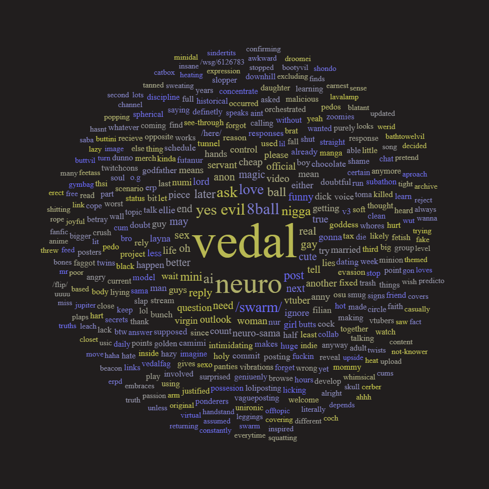 Neuro-sama is a neural network created by Vedal in 2018 for the purpose of learning to play osu! In December 2022 Vedal revived the project with the addition of a large language model, a TTS software and a Live2D model, which allow Neuro-sama to interact with her chat as a VTuber. Since then, she has been entertaining the chat with responses and unhinged rants nearly daily, as well as learning new skills such as singing, playing other games, and collaborating with other VTubers. Join /swarm/ today and welcome our new AI overlord!