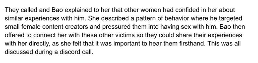>>111019748The GF was the one who contacted Bao first and asked her about Sykkuno >>111019312>>111019785He could have pulled the same song and dance on one of her friends or even on Bao himself. Remember that Senz was the one who warned Elfilea (another victim in the docky) about Sykkuno, stating that Sykkuno had targeted and wronged female friends of his. That could be anyone in whoreclan. Also, being "friends" with someone varies wildly in a digital relationship, especially when you're a big content creator who connects with dozens of people. The time and proximity you have to each person varies wildly, so it's not too much of a stretch to say that Bao wasn't privy to Madi's relationship status depending on how much time they spent together, even if they like each other and are friends