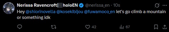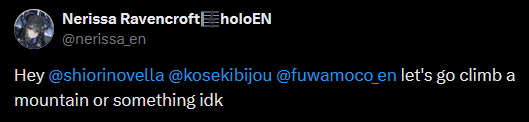 >>111115466Sorry if I'm wrong, but didn't Nerissa say she's a bit of an introvert?