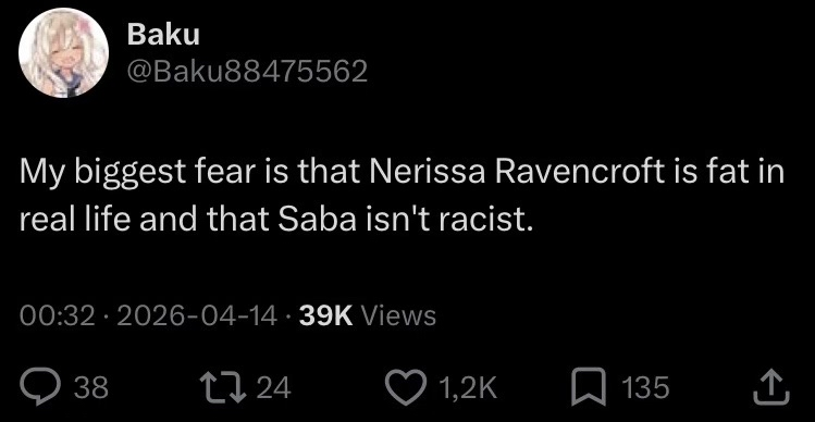 >>111039800>Is Nerissa depressed? Like does she have clinical depression?i hope so>>111040119>She sounds like she has no confidence.she’s the bottom of the barrel when it comes to hololive, there’s nothing to be confident about