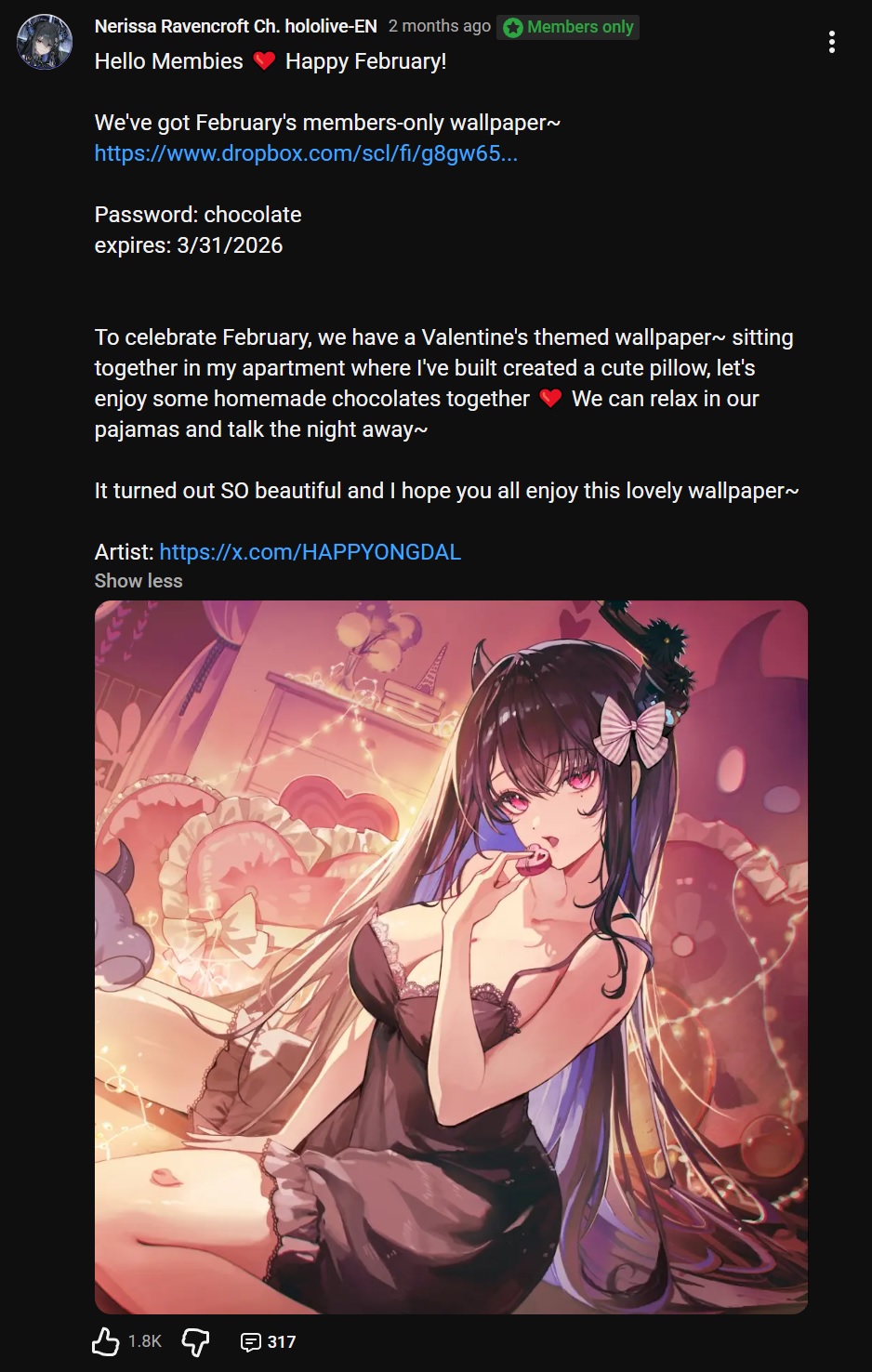 >>111108528I don't usually do but I posted it out of spite really. Haven't been a member for a while now and I haven't watched her since, but I keep reading /here/ to see if she's gotten any better. The monthly wallpapers would have been a nice thing to do when she still had the bulk of her original fans but now it just feels flat