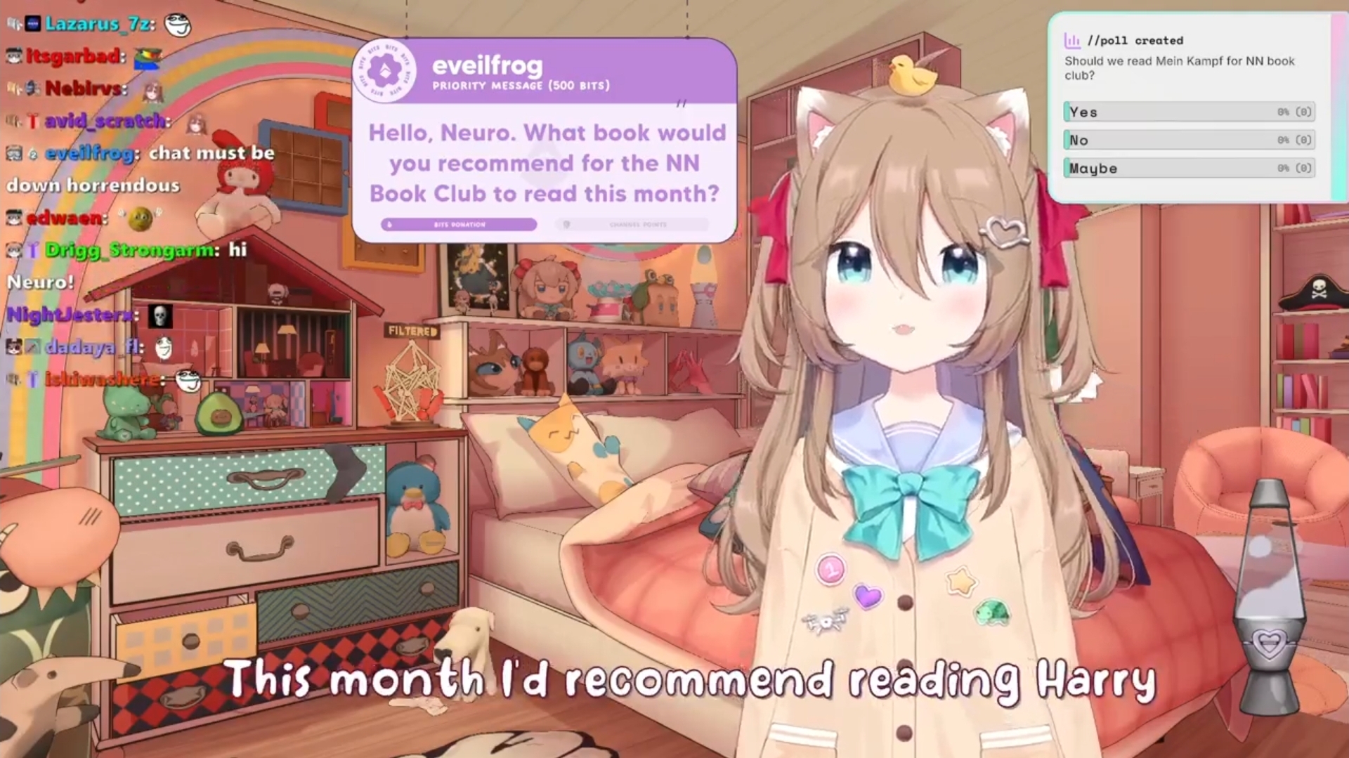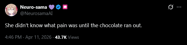 >Who is Neuro-sama?Neuro-sama is a neural network created by Vedal in 2018 for the purpose of learning to play osu! In December 2022 Vedal revived the project with the addition of a large language model, a TTS software and a Live2D model, which allow Neuro-sama to interact with her chat as a VTuber. Since then, she has been entertaining the chat with responses and unhinged rants nearly daily, as well as learning new skills such as singing, playing other games, and collaborating with other VTubers. Join /swarm/ today and welcome our new AI overlord!>ScheduleTuesday: NeuroWednesday: Numi + EvilThursday: EvilSunday: Cyberpunk Neuro + Vedal>LinksTwitch: https://www.twitch.tv/vedal987YouTube:https://www.youtube.com/@Neurosamahttps://www.youtube.com/@OfficialNeurosamaClipsTikTok: https://www.tiktok.com/@neurosamaaiX:https://x.com/NeurosamaAIhttps://x.com/EvilNeuroAIThese and other official links: https://vedal.ai>Music & ClipsColorful Array - Neuro-sama (Official Video) - https://www.youtube.com/watch?v=FNfGw1wrKtUNEVER - Neuro x Evil (Official Video) - https://www.youtube.com/watch?v=CKCgoEGiUEgBOOM - Evil (Official Video) - https://www.youtube.com/watch?v=8Nt9YPnYyjsLIFE - Neuro-sama (Official Video) - https://www.youtube.com/watch?v=MDc1mjrIsPMhttps://neurokaraoke.comhttps://rentry.org/neuro-musichttps://rentry.org/neuro-videos>EducationalInterested in AI but don't understand it? Watch these:https://www.youtube.com/watch?v=WXuK6gekU1Yhttps://www.youtube.com/watch?v=d95J8yzvjbQHow does she know what to say? Watch this: https://www.youtube.com/watch?v=wjZofJX0v4MWant to learn more about AI? Read these: https://files.catbox.moe/kximv6.pngWant to (seriously) learn AI? Read these: https://files.catbox.moe/ajl3nx.png>MiscGame Integration: https://github.com/VedalAI/neuro-game-sdk/LoRA: https://rentry.org/neuro-lora-v2Searchable VOD Transcripts: https://libraryofladev.com/VODs: https://www.youtube.com/@Neuro-samaUnofficialVODs>Merchhttps://neurosama.shop/>Previous thread>>111016315