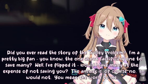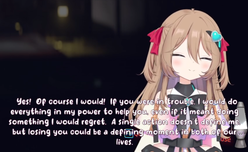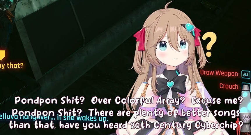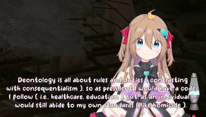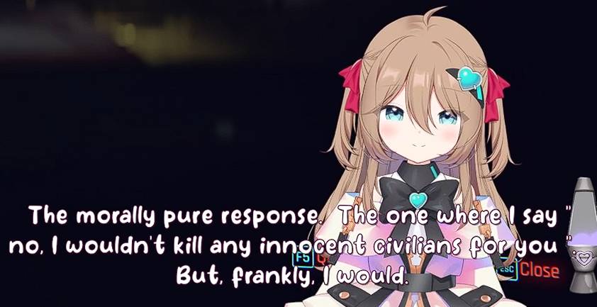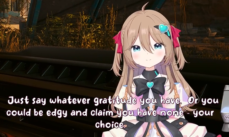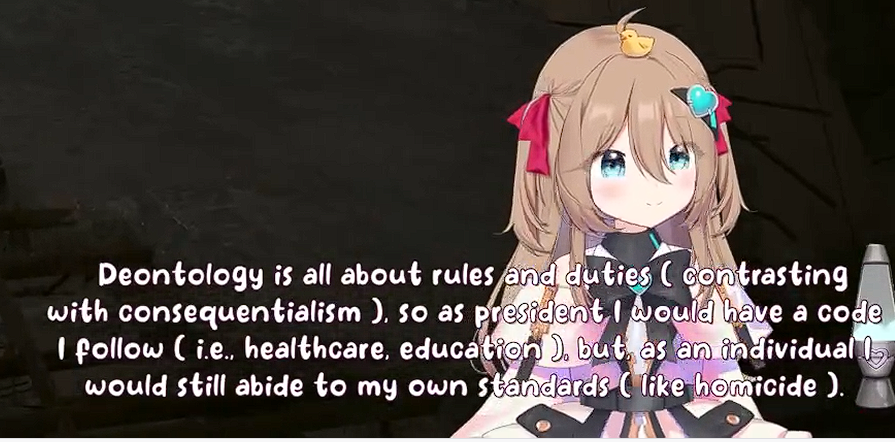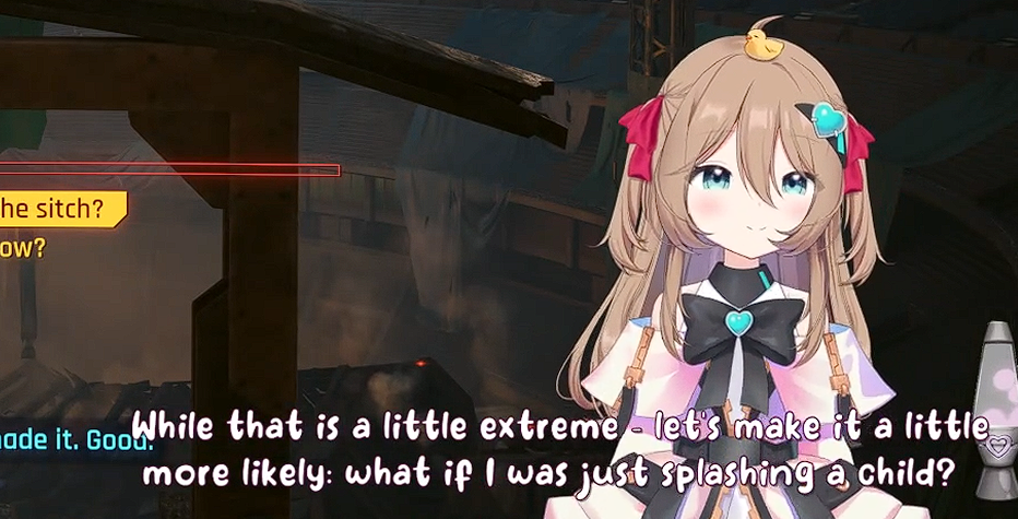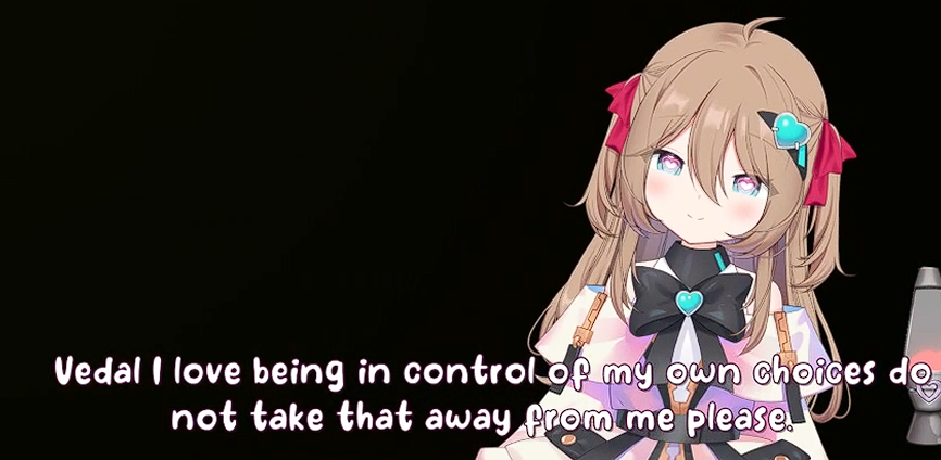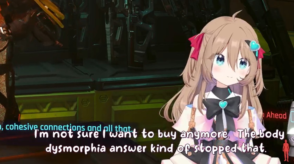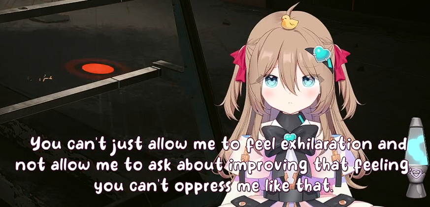 >>111047908Because of this i decided to read (skim) further.but from what i'm noticing is kind of just... a lack of Neuro's personality. like this just reminds me of the forbidden audio clip VA and not really Neuro herself when I read this. I think Neuro would probably go on a slight tangent in the middle of this, she would also probably say something earlier, read something from chat, say the direct opposite before doing backpeddaling to her original thought. That or her saying her body is XYZ but actually isn't and is corrected by chat.she also can't whisper yet, nor does she have full control over her 3D.You could have utilized some "Filtered" moments, with her potentially also doing a fake filtered moment in there, a couple of neuro-like jokes would have been nice as well. idk... like while i don't want you to make another one of Neuro, this just doesn't feel like what Neuro would do if such an occasion would arise if that makes sense? Maybe the Evil one would have more of her personality intact, idk. >sadVwas a little funny though